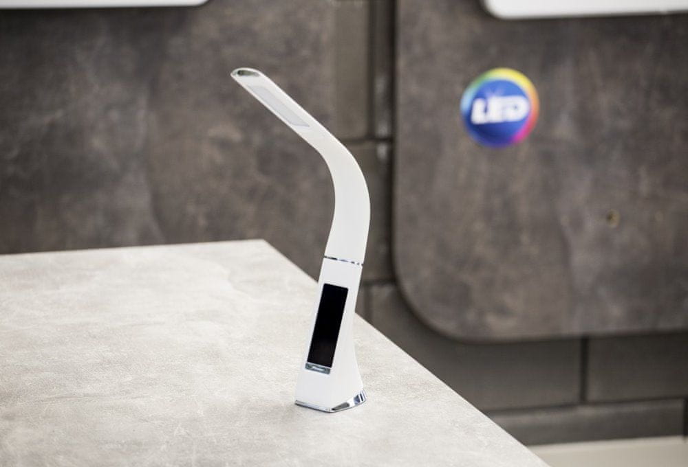 Moderna namizna svetilka LED z gibljivo roko, na dotik občutljivim uravnavanjem svetlosti in informativno ploščo LCD, ki prikazuje trenutni čas, datum in temperaturo. Če vas plošča LCD moti, jo lahko popolnoma izklopite. Napajanje poteka prek priloženega adapterja ali neposredno iz vrat USB računalnika ali napajalne banke. Priložen je 120 cm dolg kabel USB.