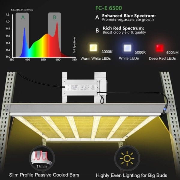 Mars Hydro FC-E 6500 LED je visokokakovostna in učinkovita svetilka v svoji kategoriji. Učinkovitost zagotavlja številna svetlobna pokritost s čipi Bridgelux, ki jih je do dvakrat več kot na primerljivih lučeh. Poleg tega ima LED plošča možnost premikanja naklonskih ročic za zagotovitev optimalne osvetlitve. Svetloba deluje pri konstantni temperaturi, zato se ne pregreva.