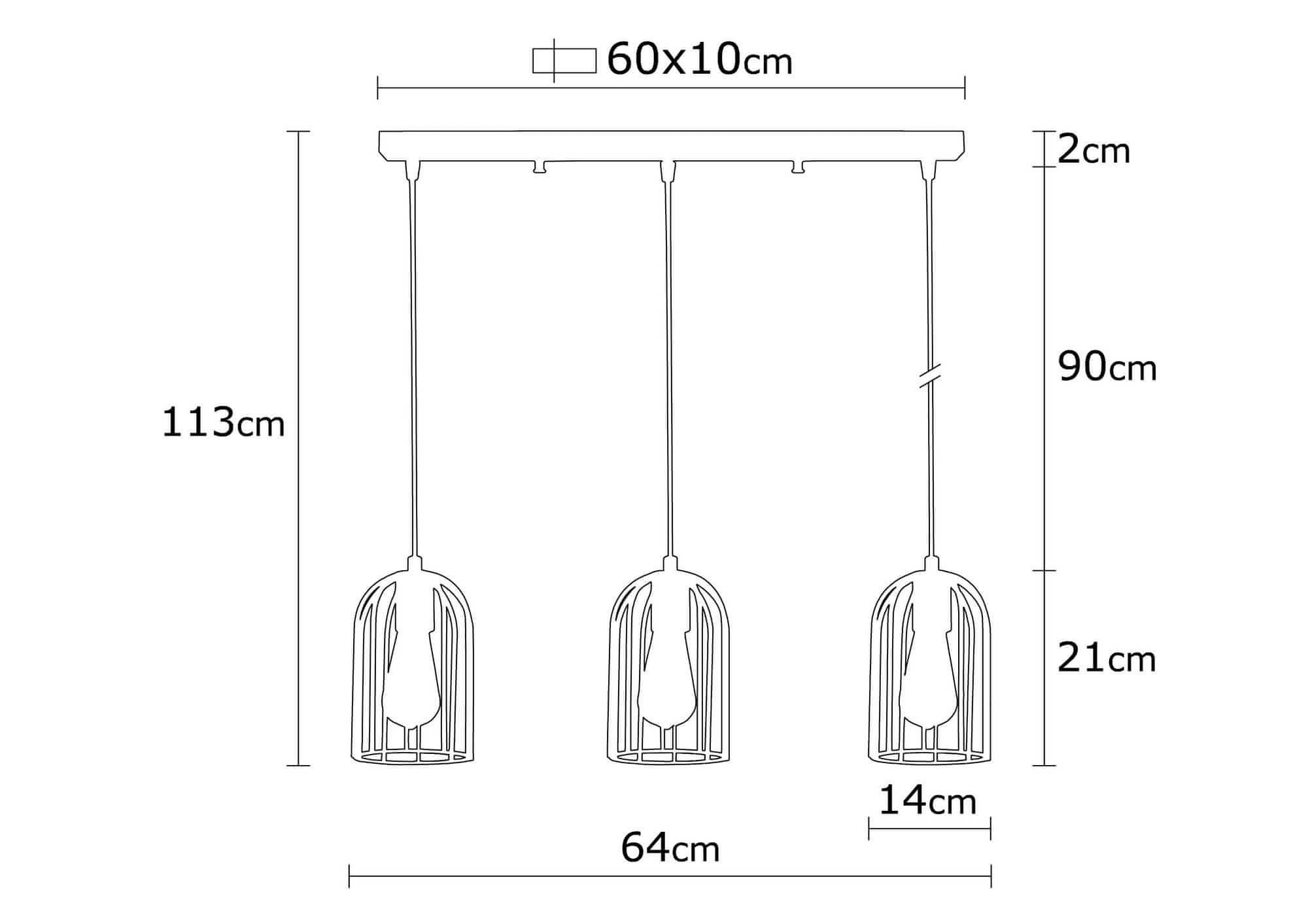 KOVINSKO TELO Velikost: 64 × 14 cm Višina: 113 cm Premer pokrovčka: 14 cm Višina pokrovčka: 21 cm Velikost osnovne plošče: 58 × 6 × 4 cm Dolžina kabla: Dolžina kabla: 90 cm Vrsta vtičnice: vtičnica: 3 x E 27 Max 40 W Koda IP: IP20