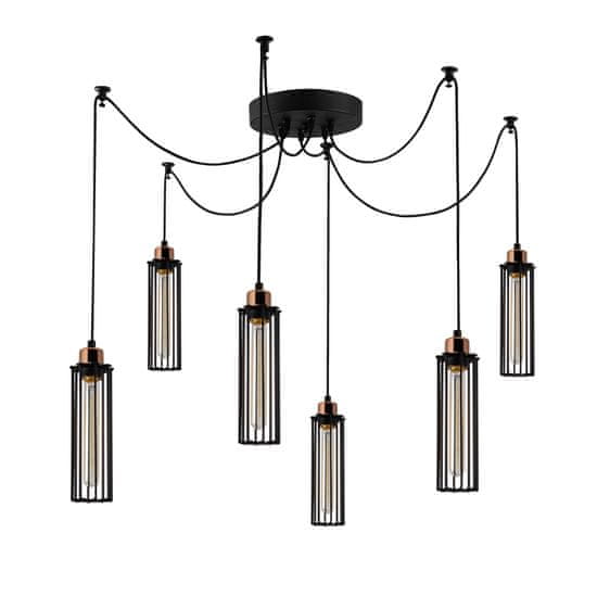 KOVINSKO TELO Premer: 128 cm Višina: 115 cm Velikost pokrovčka: 8 × 25 cm Premer osnovne plošče: 5 cm Višina osnovne plošče: 15 cm Dolžina kabla: Dolžina kabla: 180 cm Vrsta vtičnice: vtičnica: 6 x E 27 Max 40 W Koda IP: IP20
