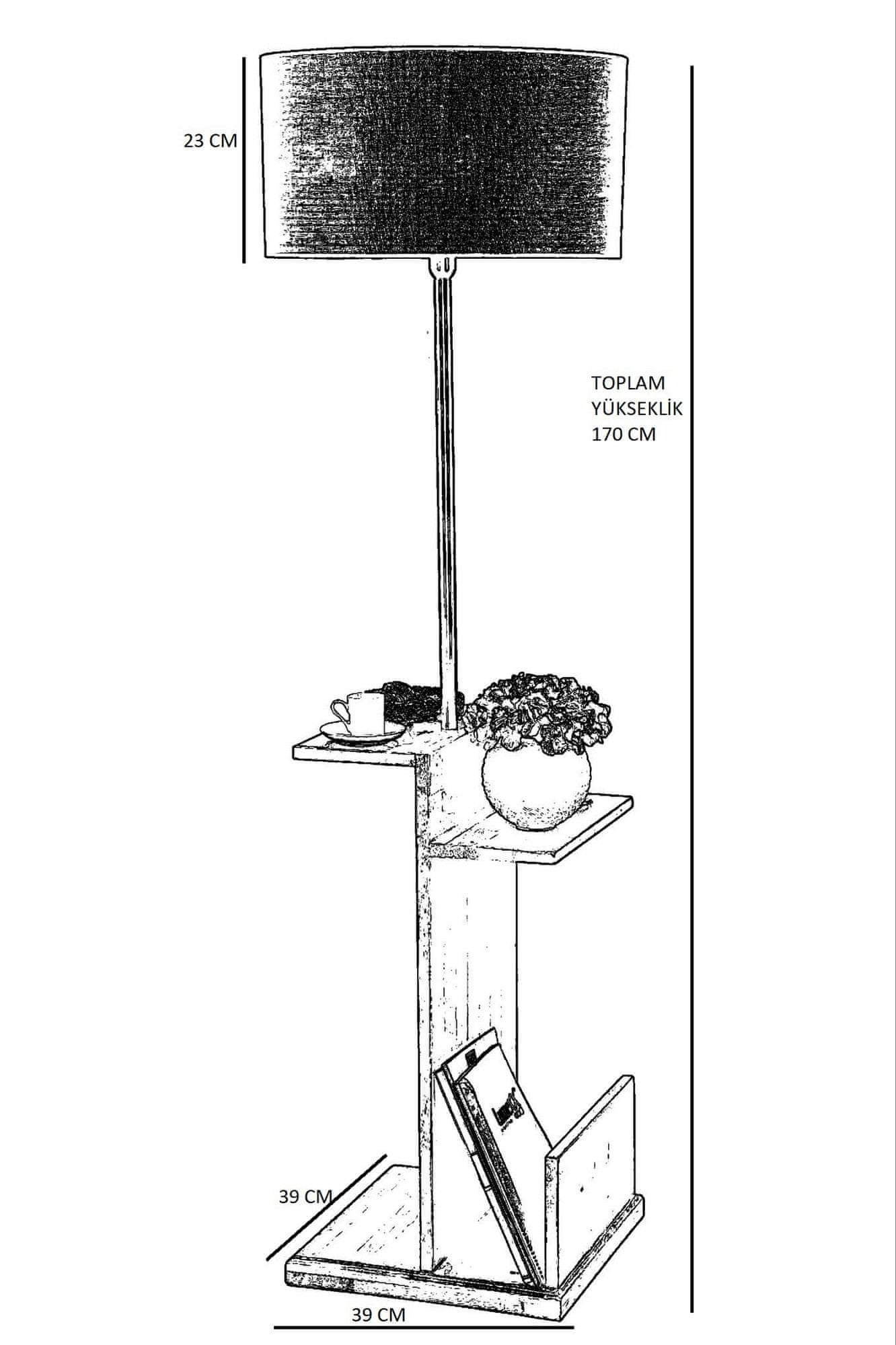 KOVINSKO TELO Pokrovček iz tkanine Lesene police Dolžina pokrovčka: 31 cm Premer pokrovčka: 45 cm Velikost noge: 39 × 39 cm Skupna višina: 170 cm Gumb za vklop in izklop na kablu Elektrostatična barva, posušena v pečici Vrsta vtičnice: E 27 Max 60 W Največja napetost: 220–240 V