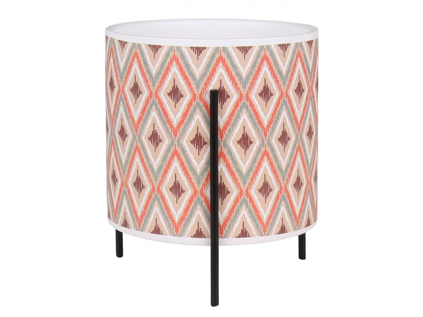 Črno, kovinsko stojalo ne le dodaja stabilnost, ampak tudi elegantno kontrastira z vzorčastim dizajnom.