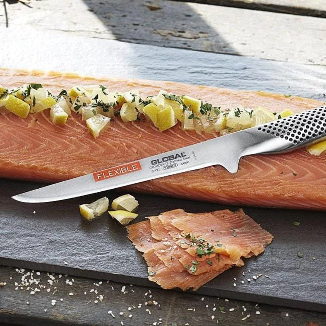 G-30 je specializiran nož za filiranje, ki je bil narejen posebej za švedske oboževalce nožev Global, ki jih je oblikoval japonski umetnik Komin Yamada. Dolgo in fleksibilno rezilo (21 cm) zlahka zdrsi med kožo in meso ribe. Prav tako je primeren za rezanje tankih rezin pršuta. Nož je izdelan iz nerjavečega jekla Cromova 18, rezilo pa se ponaša s 15-stopinjskim rezalnim robom. Obtežen votel ročaj omogoča enostavno rokovanje in daje ravnovesje. Vzdrževanje: operite ga v vroči vodi in dobro obrišite s suho krpo. Ne pomivajte ga v pomivalnem stroju in ne uporabljajte ga s kloriranimi izdelki, ki lahko poškodujejo posebno jeklo rezila.