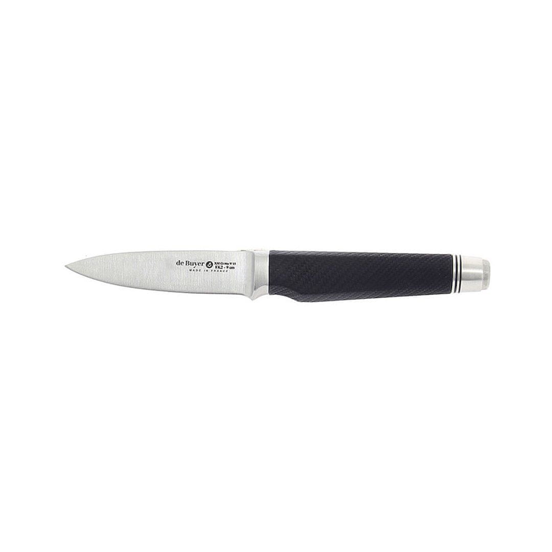 DE BUYER FK2 nož z rezilom dolgim 9 cm je idealen za vsako manjše rezalno opravilo. Uporablja se lahko za lupljenje, rezanje, odstranjevanje zunanjih delov in semen, rezanje sadja, izrezovanje zelenjave v okraske itd. Rezilo je narejeno iz vrhunskega nemškega nerjavečega jekla X50CrMoV15 (1.4116), posebej poznanega po vzdržljivosti in pogosto uporabljenega ravno v proizvodnji profesionalnih kuharskih nožev. Ročaj noža je narejen iz visokotehnoloških karbonskih vlaken, ki omogočajo odličen, nedrseč oprijem.