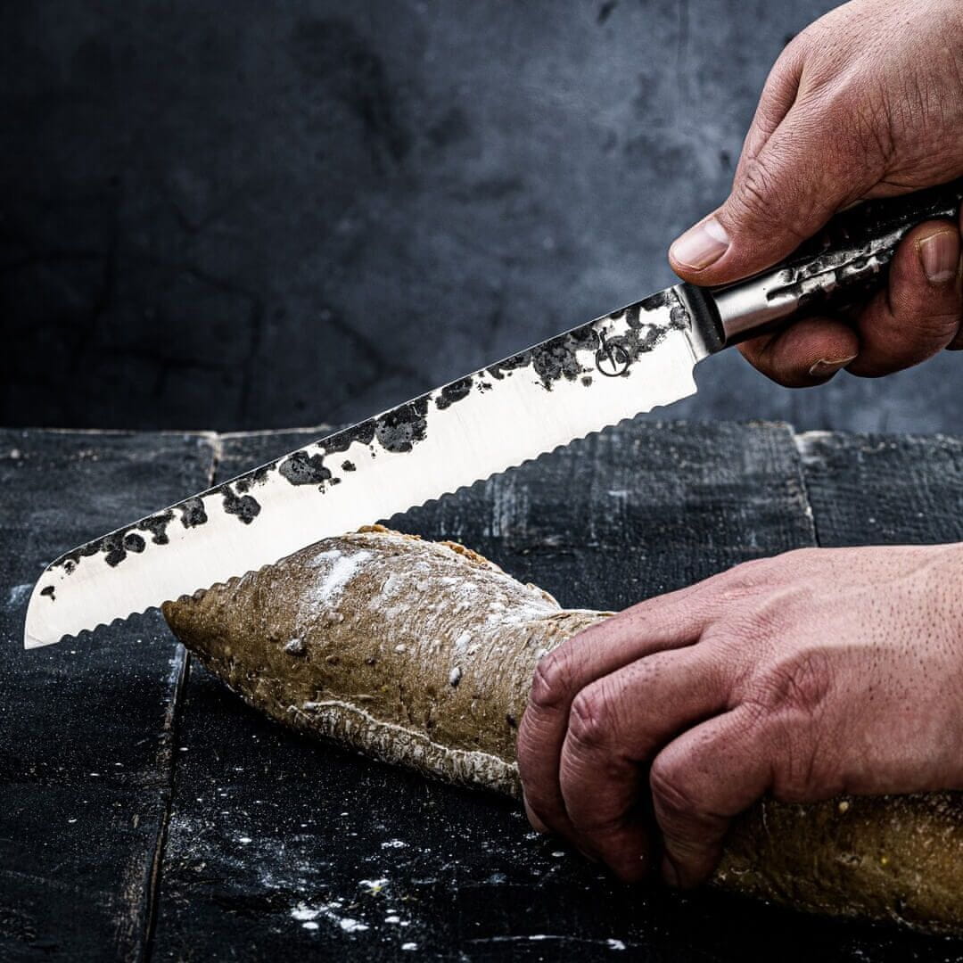 Nož Brute je posebej zasnovan za rezanje kruha ter odličen za rezanje večje zelenjave ali sadja, kot so melona, buča ali ananas. Ima dolgo, nazobčano rezilo dolžine 20 cm. Oblika rezila sledi tradiciji evropske kuhinje, kakovost in vzdržljivost pa zagotavlja japonsko jeklo 440C s trdoto 58 Rockwell. Nož iz serije Brute je ročno kovano, unikatno delo. Njegov značilen, grobo obdelan videz poudarja ročno izdelavo in daje nožu surov, avtentičen značaj. Rezilo je debelo 2 mm in brušeno pod kotom 18°. Ročaj iz valjanega nerjavečega jekla s posebno odprtino dodaja edinstven pečat, hkrati pa zagotavlja trpežnost, lahkotnost in udobno uporabo. Skupna dolžina noža z ročajem je 34 cm. Nož je pakiran v luksuzni leseni embalaži, zato je odlično darilo ali investicija v lastno kuhinjo. Dimenzija embalaže: 39,3×9,3×4 cm