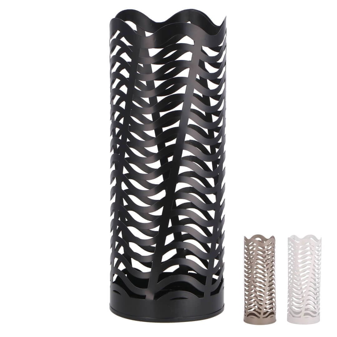 Okrogla posoda za dežnike dimenzije 19 cm in višine 49 cm je izdelana iz trpežne kovine z zanimivim detajlom v obliki valovitih črt. Celoten opis