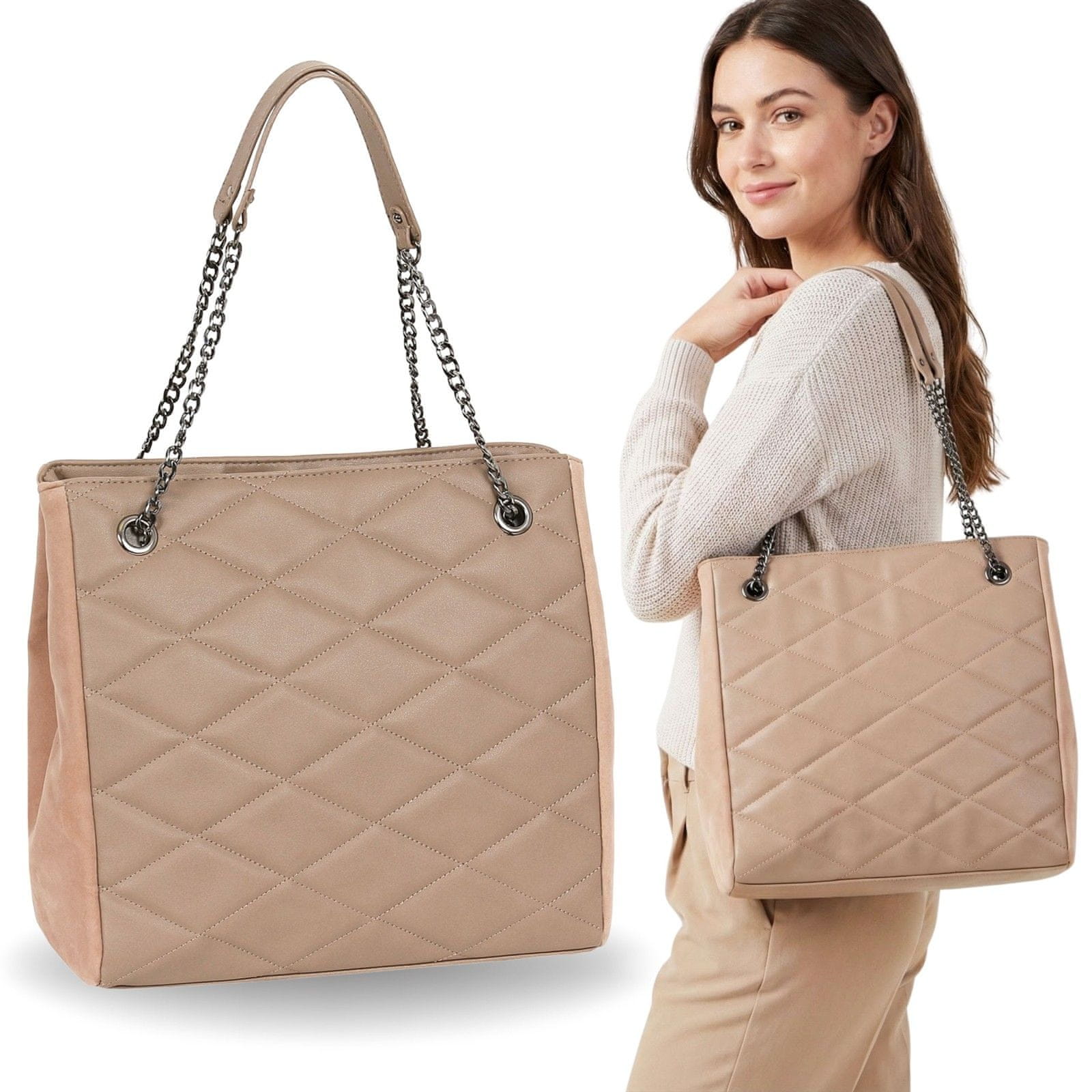 Kombinacija mehkega materiala z nežnim sijajem in kovinskih verižnih ročajev ji daje sodoben, ženstven pridih.