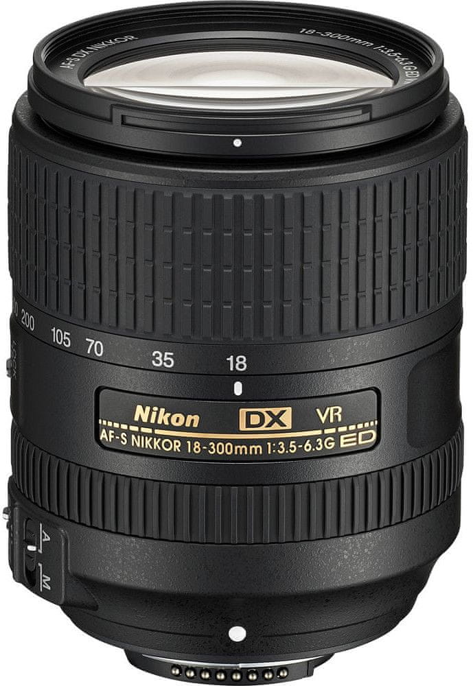 Objektiv Nikon AF-S Nikkor 18–300 mm f/3,5–6,3G ED VR ima izjemno kompaktno ohišje in je idealen za potovanja ter za fotografiranje amaterskih športov ali živali. Elementi iz ED-stekla in asferične leče skrbijo za visoko ločljivost in kontrast. Nikonov sistem zmanjšanja tresljajev ustvarja jasne slike, tudi v super telefoto območju. Praktično stikalo za zaporo zooma preprečuje premikanje objektiva med prenašanjem.