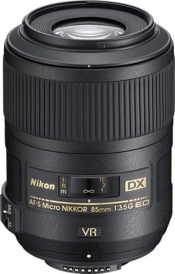 Objektiv Nikon AF-S DX Micro Nikkor 85mm f/3.5G ED VR je kompakten in lahek makro objektiv za format DX z visokokakovostno optiko. Objektiv je opremljen z Nikonovim sistemom za zmanjševanje vibracij druge generacije, ki nudi mirno sliko na senzorju in v iskalu, kar omogoča prilagodljivejše fotografiranje iz roke. Reprodukcija v merilu 1 : 1 omogoča bližnje posnetke izjemno finih tekstur in podrobnosti v naravni velikosti. Tih motor samodejnega ostrenja, ki ga omogoča tehnologija Silent Wave Motor, v kombinaciji z notranjim ostrenjem dela ta objektiv idealen za približevanje motivom. Ker je objektiv preprost za rokovanje, je idealen za raziskovanje sveta makro fotografije.