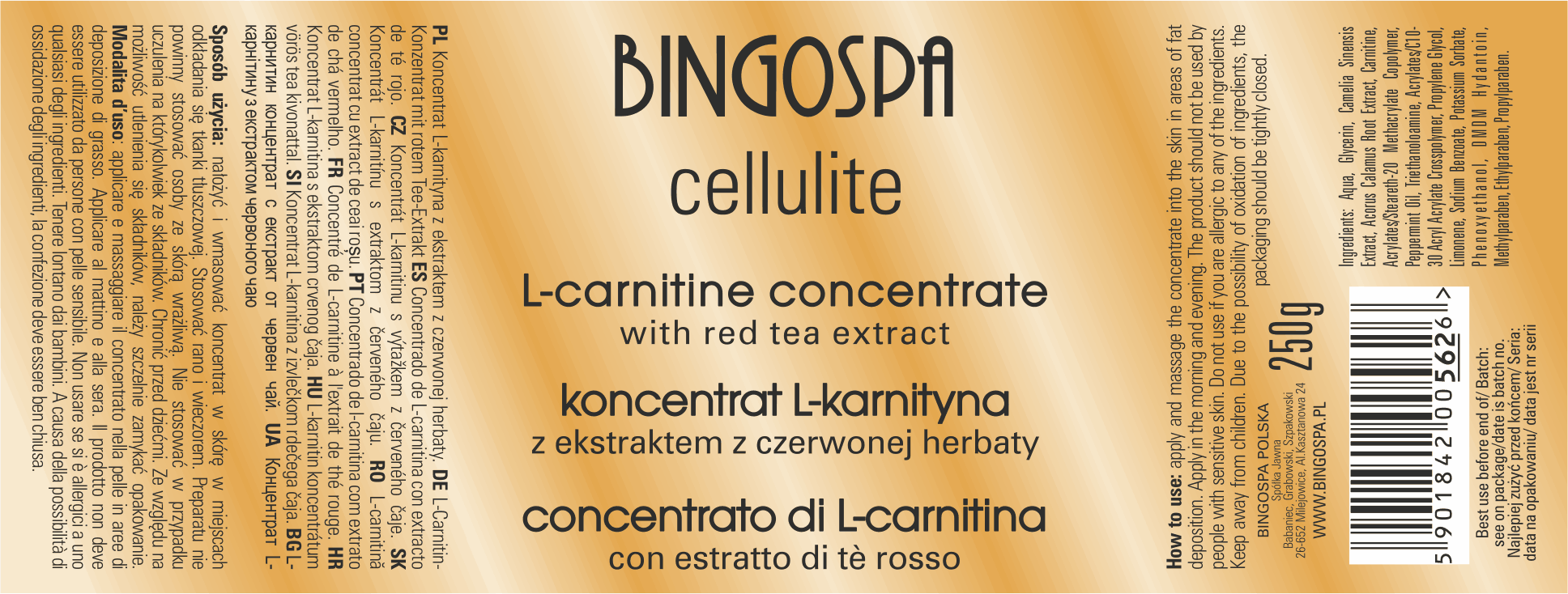 L-karnitin – derivat aminokislin lizina in metionina, ki se naravno pojavlja v našem telesu. L-karnitin je pomemben dejavnik v boju proti celulitu, saj je odgovoren za transport maščobnih kislin v mitohondrije, kjer se pretvorijo v energijo. Sodeluje tudi pri presnovi ogljikovih hidratov in nekaterih aminokislin ter uravnava presnovo lipidov. L-karnitin spodbuja limfni pretok, olajša kurjenje odvečne maščobe in odstranjuje presnovne odpadne produkte.