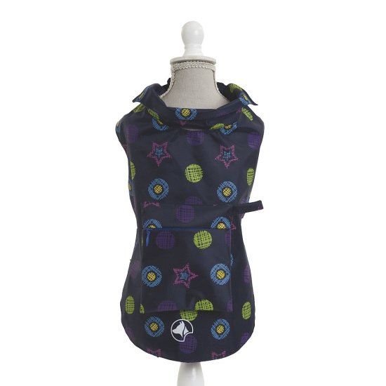 Elegantna pelerina za psa z motivom koles in modrih zvezdic na modri podlagi. Podloženo.