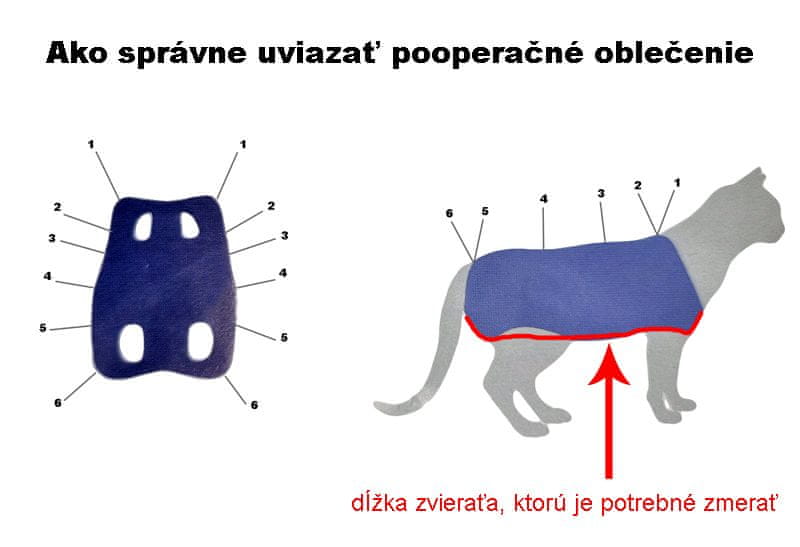 Pooperativna zaščitna obleka za psa ali mačko je izdelana iz naravnega 100% bombaža. Ohranja rano suho z zadostnim dostopom zraka. Pooperativna zaščitna obleka je zelo naravna za psa ali mačko in ne ovira gibanja kot klasična ovratnica. Hkrati deluje kot zadostna ovira pred lizanjem in puljenjem šivov. Oblačila so zelo zračna in pralna pri 30°C. Enostavno zavezovanje z vezalkami. Priporočajo veterinarji.