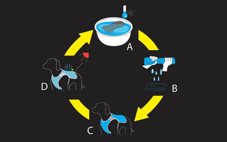 Hladilni brezrokavnik, ki preprečuje pregrevanje psa v vročih poletnih dneh. Učinkovitost jopiča temelji na hladilnem učinku vode. Brezrokavnik splaknemo s hladno vodo, ožamemo in oblečemo na psa. Brezrokavnik učinkovito hladi predel prsi in trebuha psa, od koder se hladilni učinek razširi na celotno telo. Izdelek ima odlično absorpcijsko sposobnost. Brezrokavnik se hitro in enostavno obleče. Primeren je za vse vrste aktivnosti na prostem, vključno s pasjimi razstavami. Brezrokavnik pokriva celoten hrbtni del.