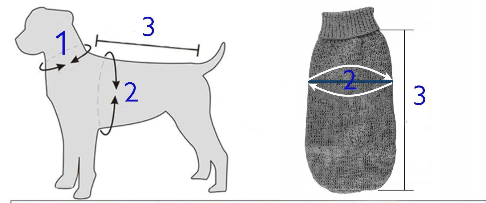 ✅pulover komplet ✅raztegljiv ✅z ovratnikom ✅popoln za hladne jesenske in zimske dni ✅moden vzorec ✅elastični trakovi za tačke preprečujejo drsenje ❄️❄️❄️❄️❄️❄️❄️❄️❄️❄️❄️❄️❄️❄️ ☑️obseg pod pazduhami: maks. 60 cm ☑️skupna dolžina (z ovratnikom): 50 cm ☑️dolžina hrbta: 45 cm Kako izmeriti svojega psa?? Pomembne so 3 dimenzije, ki jih vedno navedemo pri vsakem kompletu. Dimenzije so prikazane na spodnji sliki: 1️⃣ obseg vratu (številka 1 na fotografiji), merjen na najširši točki, kot ovratnik (tega ne navajamo vedno pri puloverjih – imajo zelo raztegljive puloverje) 2️⃣ obseg prsnega koša (številka 2 na fotografiji), merjen na najširši točki 3️⃣ dolžina hrbta (številka 3 na fotografiji), merjena od zatilja do repa. Navedene dimenzije so MAKSIMALNE vrednosti.