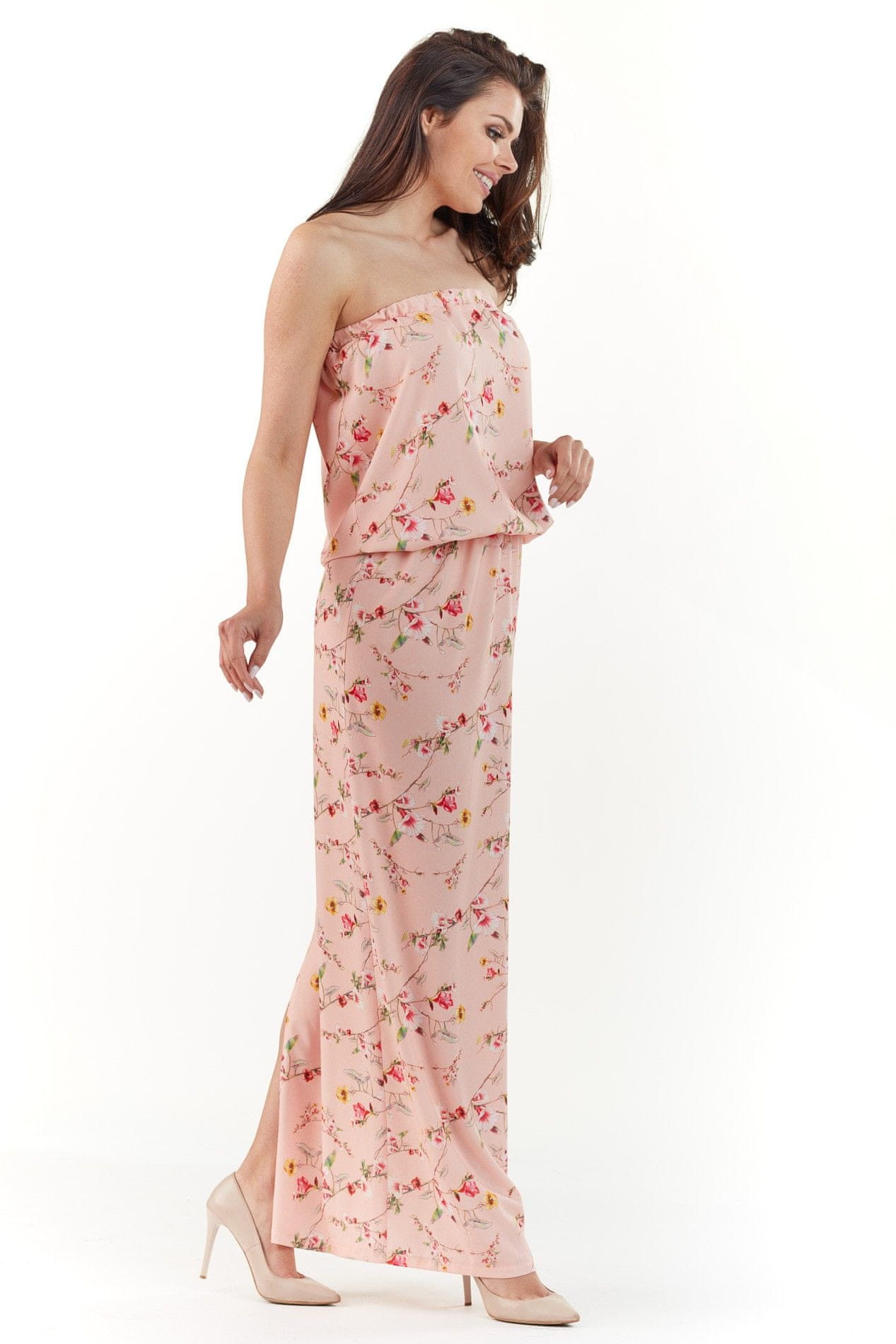 Popis:Maxi obleka z nežnim cvetličnim vzorcem. Obleka je brez naramnic in ima elastičen pas.Materiál: 98% poliester, 2% elastan