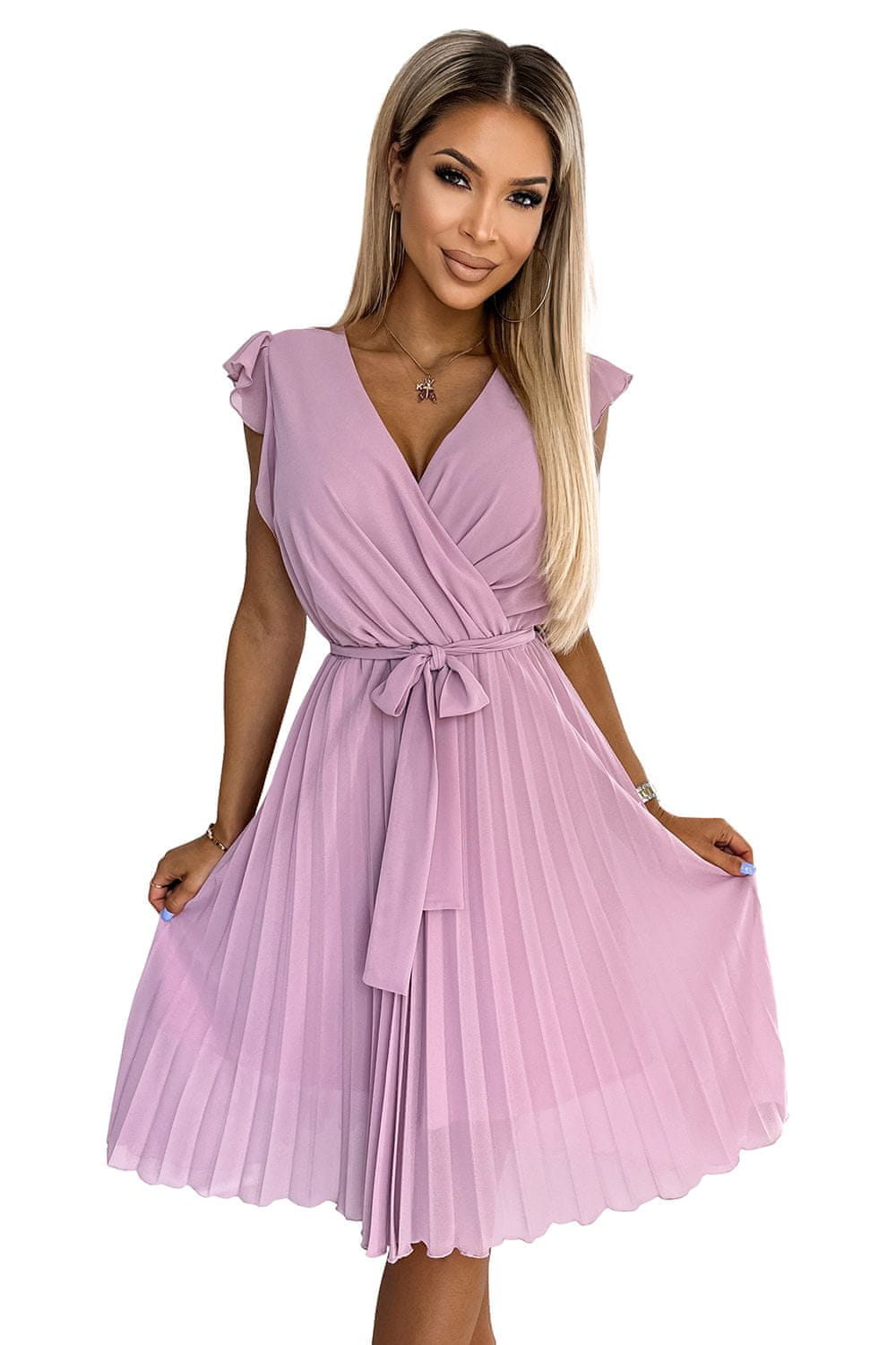 Popis:Polina – obleka iz šifona z izrezom in volančki na ramenih. Blagovna znamka Numoco. Poljska proizvodnja.Materiál: 95% poliester, 5% elastan