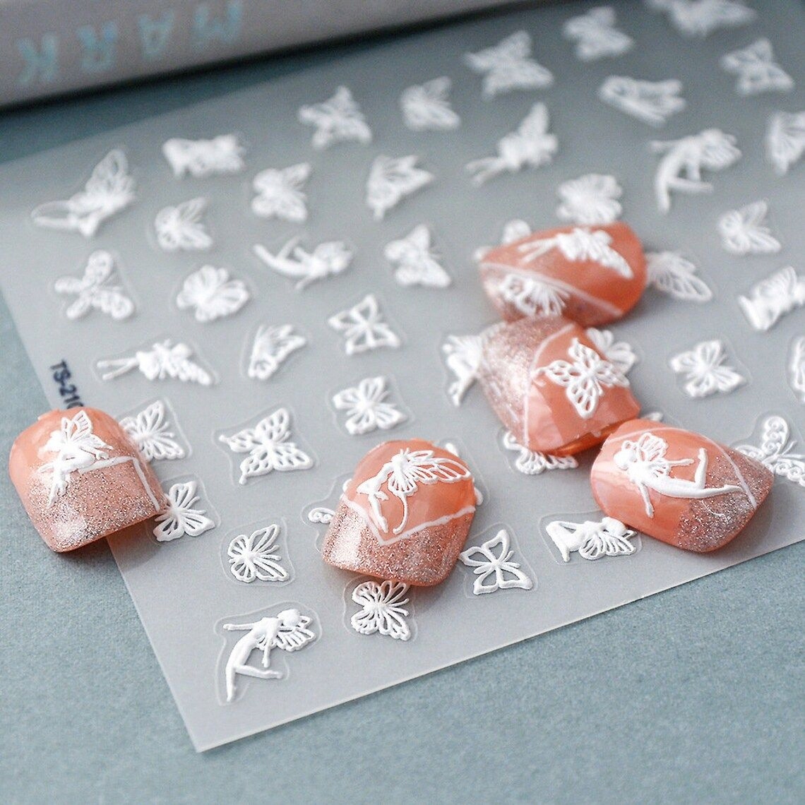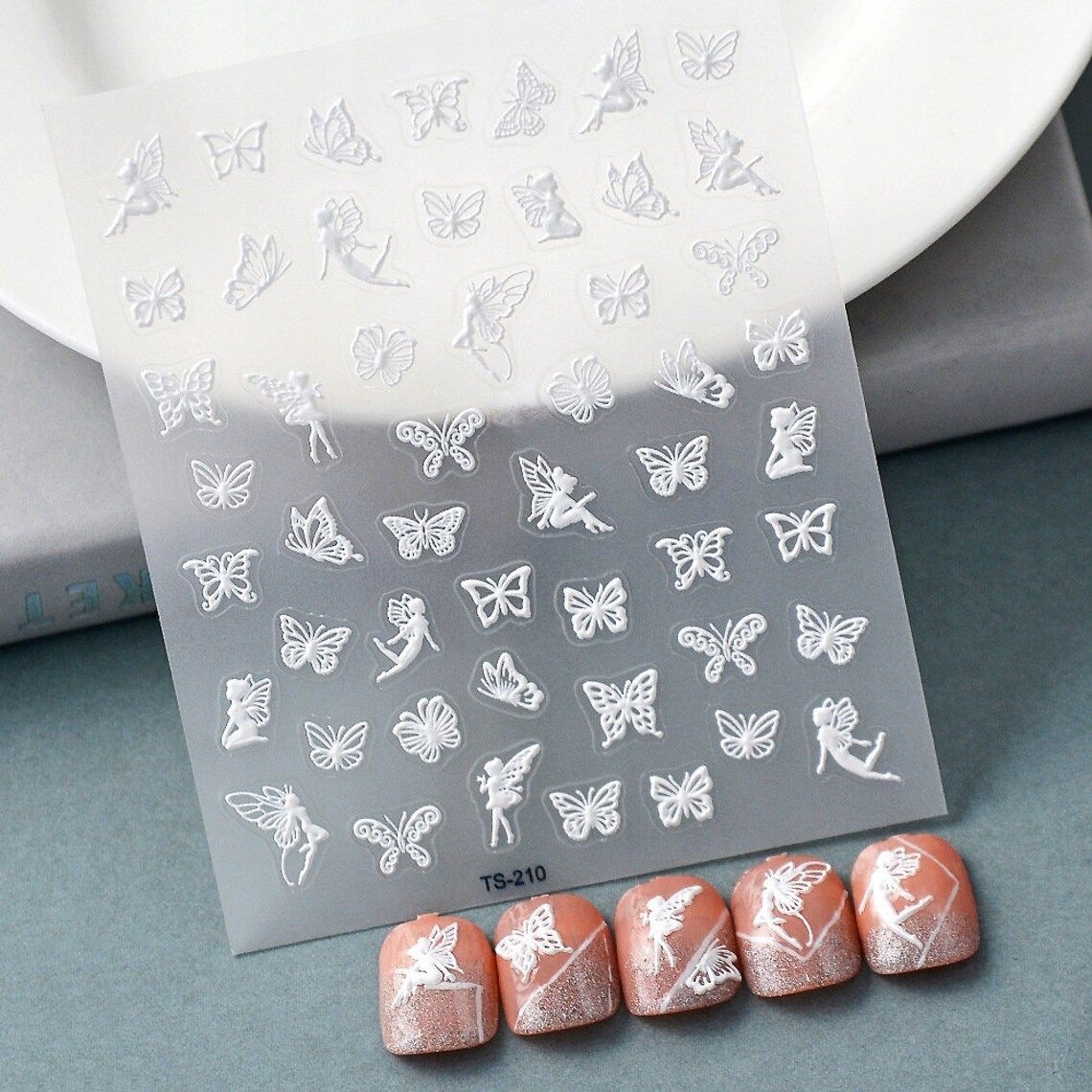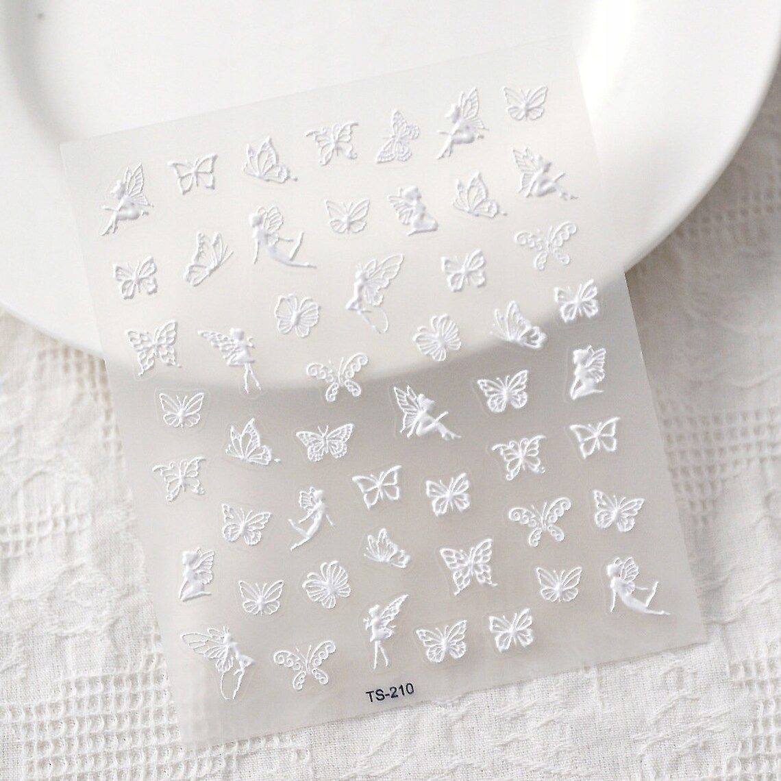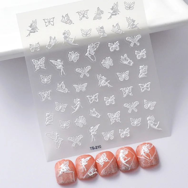 Bele samolepilne 3D konveksne nalepke za nohte z vzorci metuljev in vile Celoten opis