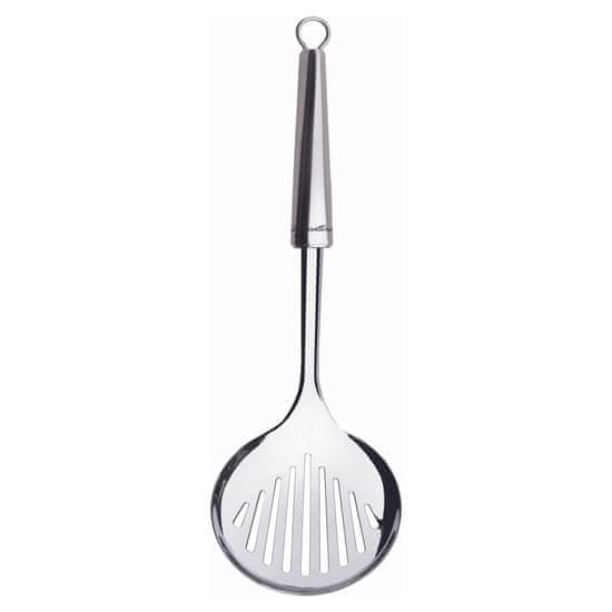 LAGOSTINA OKROGLA LOPATKA ZA OBRAČANJE CUCINIERI z dolžino 33 cm je nepogrešljiv pripomoček v vsaki kuhinji. Reže na lopatici omogočajo, da odvečna maščoba odteče skoznje. Izdelana je iz visokokakovostnega nerjavečega jekla 18/10, za katerega je značilna visoka obstojnost, odpornost proti koroziji in živilskim kislinam. Ergonomsko oblikovan ročaj, zagotavlja udobje med njeno uporabo, držalo na koncu pa omogoča obešanje. Primerna je za pomivanje v pomivalnem stroju.