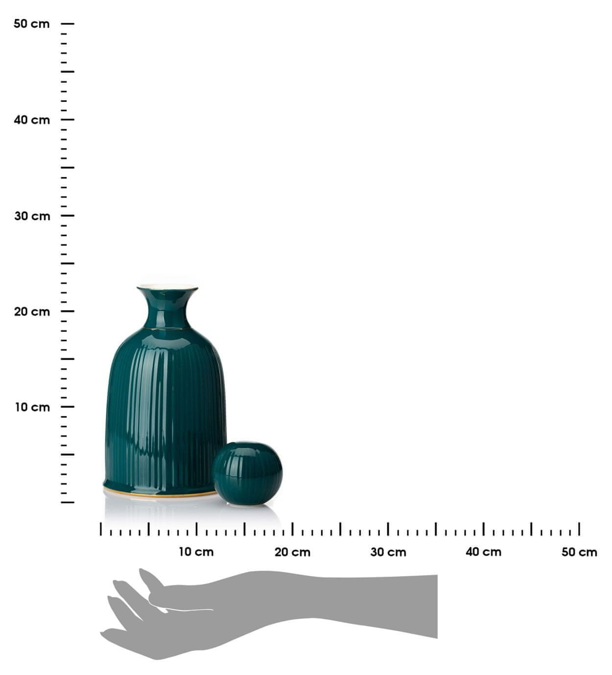 Družinsko srečanje ali zabava s prijatelji. V obeh primerih potrebujemo nekaj za postrežbo pijač ali drugih pijač gostom. Na pomoč priskoči eleganten keramični vrč. Elegantna temno zelena barva z zlatimi poudarki bo odlično dopolnila moderne, glamurozne interierje. Rebrasta površina zagotavlja varen oprijem in preprečuje zdrs plovila. Karafa je na voljo tudi v črni in zlati barvi. Mere: višina: 22 cm