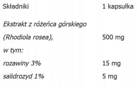 Rhodiola rosea (60 kapsul) Prehransko dopolnilo Delovanje: Ugoden učinek na srce in ožilje, Spodbuja živčni sistem, Izboljšuje telesno pripravljenost in zmogljivost, Ugoden učinek na prebavni sistem, Izboljša kognitivne funkcije in duševno aktivnost. Kaj je Rhodiola rosea? Rhodiola rosea je trajnica, ki jo najdemo predvsem v severni in osrednji Aziji, pa tudi v gorskih predelih Evrope in subarktičnih predelih Severne Amerike. Na Poljskem se naravno pojavlja v razpokah apnenčastih kamnin v Sudetih in Karpatih. Ime „rhodiola“ se nanaša na značilen vonj korenike, podoben vrtnici, in rožnato barvo, ki se pojavi v notranjosti po njenem prelomu. Izvleček Rhodiola rosea je vir številnih aktivnih snovi, ki pozitivno vplivajo na telesne funkcije, med katerimi so najpomembnejši derivati cimetovega alkohola, skupaj znani kot rozavini, in salidrozid, fenolna spojina. Poleg tega je izvleček Rhodiola rosea tudi zakladnica drugih koristnih snovi: monoterpenov, triterpenov, flavonoidov, eteričnih olj in polifenolov, kot sta galna in klorogena kislina. Kako deluje Rhodiola rosea? Rhodiola rosea je razvrščena kot adaptogen, skupina snovi rastlinskega izvora, ki povečujejo odpornost na stres in ohranjajo telesno ravnovesje. Tako kot drugi adaptogeni tudi ona povečuje odpornost telesa na stresorje, podpira živčni in imunski sistem. Poleg tega pomaga ohranjati pravilno delovanje krvožilnega sistema, s čimer celicam zagotavlja zadostno količino kisika in hranil. Zdravstvene učinke Rhodiola rosea so prepoznali že pred tisočletji na Kitajskem, kjer se rastlina uspešno uporablja v tradicionalni medicini. Sledi uporabe te rastline najdemo tudi pri starih Grkih in Rimljanih ter skandinavskih Vikingih. Kakšna je standardizacija in izvor izvlečka? Da bi zagotovili, da je izdelek proizveden z uporabo visokokakovostnega izvlečka iz veljavnega botaničnega vira, je treba pozornost nameniti tako standardizaciji izvlečka kot razmerju med rosavinom in salidrozidom. Značilnost vrste Rhodiola rosea je razmerje med rosavinom in salidrozidom 3:1. Izdelki, ki se razlikujejo v razmerju teh dveh snovi ali tisti, ki standardizirajo le eno spojino, lahko vsebujejo nekakovosten izvleček, pridobljen iz drugih rastlinskih vrst, ki pripadajo rodu Rhodiola, ne pa iz Rhodiola rosea. Izvleček, ki ga vsebuje naš izdelek, je bil proizveden izključno iz rastlin, ki pripadajo vrsti Rhodiola rosea, ki rastejo v neokrnjeni in neonesnaženi regiji Altajskega gorovja v Aziji. Zato ga zaznamuje ustrezno razmerje med rosavinom in salidrozidom 3:1 ter visoka, dvojna standardizacija na 3 % rosavinov in 1 % salidrozida. Sestavine: Izvleček Rhodiola rosea, standardiziran na 3 % rozavinov in 1 % salidrozida, ovojnica kapsule: (vezivo: hidroksipropil metilceluloza) Priporočeni dnevni odmerek, potreben za dosego koristnega učinka izdelka: 1 med obrokom. Ne prekoračite priporočenega dnevnega odmerka. Tega izdelka se ne sme uporabljati kot nadomestilo za raznoliko prehrano. Priporoča se raznolika prehrana in zdrav način življenja. Sestavine: 1 kapsula: Izvleček Rhodiola rosea, 500 mg, vključno z: rozavini 3 % 15 mg, salidrozid 1 % 5 mg. Neto teža: 60 kapsul. Prehranskih dopolnil se ne sme uporabljati kot nadomestilo za raznoliko prehrano ali zdrav način življenja. Ne prekoračite priporočenega dnevnega odmerka. Prehranska dopolnila shranjujte izven dosega majhnih otrok. Pred uporabo tega izdelka priporočamo, da preberete podrobne informacije na embalaži ali priloženi navodili. Pogoji shranjevanja: Hranite v tesno zaprti posodi. Na hladnem in suhem mestu, izven dosega otrok. Zaščitite pred svetlobo. Proizvajalec: MEDICALINE Konrad Malitka, Ostrówiec 150, 05–480 Karczew;