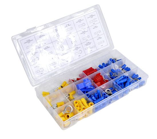 • Komplet sto petinšestdesetih električnih konic in konektorjev v osemnajstih priljubljenih velikostih.