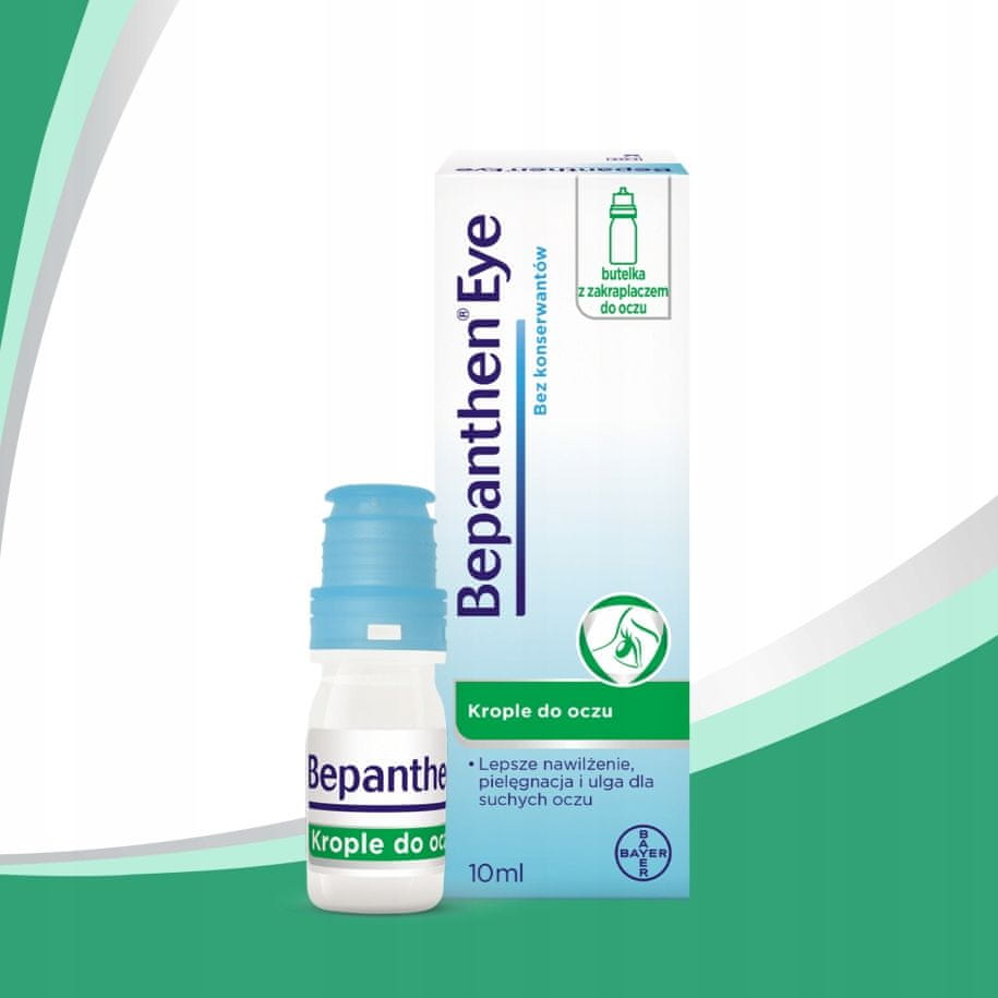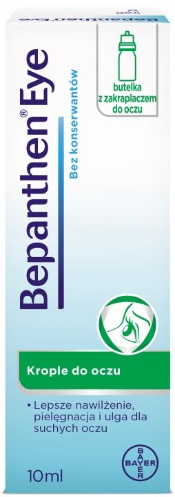 Bepanthen Eye 10 ml Bepanthen Eye – vlažilne kapljice, ki olajšajo suhe, rdeče ali razdražene oči. Bepanthen Eye lajša simptome suhih oči tako, da ščiti in vlaži površino očesa ter zagotavlja občutek olajšanja. Te kapljice so primerne tudi za uporabnike kontaktnih leč. Kontaktnih leč med nanosom kapljic za oči ni treba odstraniti. Olajšanje za suhe oči po oftalmoloških pregledih. Deluje na vse plasti solznega filma. Bepanthen Eye ne vsebuje konzervansov in ga bolniki dobro prenašajo pri dolgotrajni uporabi. Kaj je Bepanthen Eye? Bepanthen Eye so vlažilne kapljice za suhe oči, ki ščitijo, vlažijo in ustvarjajo zaščitno plast na površini očesa. Kombinacija natrijevega hialuronata in dekspantenola zagotavlja dolgotrajno olajšanje nelagodja, povezanega z: mehanskim draženjem površine očesa, npr. pri nošenju trdih ali mehkih kontaktnih leč ali med pregledi oči; neugodnimi vplivi okolja, kot so klimatska naprava, veter, mraz, suh ali onesnažen zrak; in intenzivnim delom z očmi, npr. delom za računalnikom, z mikroskopom ali dolgotrajno vožnjo. Kako delujejo kapljice za oči Bepanthen? Kapljice za oči Bepanthen ustvarijo sterilno, viskoelastično in prozorno zaščitno plast za roženico brez konzervansov. Bepanthen Eye vsebuje hialuronsko kislino v obliki natrijeve soli, ki zaradi svojih fizikalnih lastnosti ustvari enakomerno, trpežno in dolgotrajno zaščitno plast na površini očesa, ne da bi pri tem ogrozila ostrino vida. Bepanthen Eye vsebuje tudi provitamin B5 (dekspantenol), ki ima sposobnost vezave velikih količin vode, vlaži in neguje površino očesa ter hkrati podpira vlažilni učinek natrijevega hialuronata. Kako pravilno uporabljati kapljice za oči Bepanthen? Kapljice nanesite enkrat ali večkrat na dan, po potrebi. Eno kapljico vkapajte v konjunktivalno vrečko očesa 3–5-krat na dan. Po vkapanju kapljic počasi zaprite oči, da tekočina enakomerno prekrije celotno površino očesa. Sestavine: 1 ml vsebuje: natrijev hialuronat 0,15 %, dekspantenol 2 %, natrijev klorid, natrijev citrat, citronsko kislino, vodo za injekcije. To je medicinski pripomoček. Uporabljajte v skladu z navodili za uporabo ali etiketo. Oglaševalski subjekt: Bayer Sp. z o. o. Proizvajalec: Penta Arzneimittel GmbH, Werksstrasse 3, 92551 Stulln Medicinski pripomoček – oznaka CE št.: 0483 Ima izjavo EU o skladnosti Vključuje uporabniški priročnik in vmesnik v poljščini Vključuje etiketo v poljščini