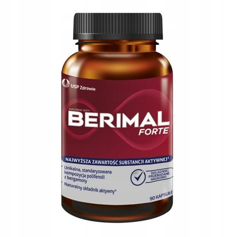 Berimal FORTE 90 kapsul Prehransko dopolnilo. Prvi izdelek na Poljskem z visoko vsebnostjo bergamotnih polifenolov (Citrus bergamia Risso), kar je potrjeno z znanstvenimi raziskavami, v obliki ActiBPF. Berimal Forte zagotavlja „bergamotkov učinek“ tako, da vašo dnevno prehrano dopolni z znanstveno preizkušeno sestavo polifenolov. Zaradi vsebnosti vitamina C ima tudi antioksidativne lastnosti, podpira pravilno delovanje krvnih žil in presnovo.** Vitamin C prispeva k pravilni proizvodnji kolagena za zagotovitev pravilnega delovanja krvnih žil, pomaga zaščititi celice pred oksidativnim stresom in prispeva k ohranjanju pravilne energijske presnove. Navodila: Vzemite 1–2 kapsuli na dan pred obrokom. Kapsulo pogoltnite z vodo. Vsebine kapsule ni priporočljivo posipati po hrani (zaradi grenkega okusa). Aktivna sestavina, ActiBPF, je 100 % naravna. Vsebuje edinstveno sestavo bergamotnih polifenolov (BPF – polifenolna frakcija, pridobljena iz bergamotke), standardiziranih na prisotnost petih flavonoidov (iz skupine polifenolov): neoeriocitrin, neohesperidin, naringin, melitidin in brutieridin. Sestavine te sestave delujejo skupaj, da zagotavljajo najboljše možne rezultate. Berimal Forte je visokokakovosten pripravek, izdelan v skladu s standardi dobre proizvodne prakse (GMP). Ne vsebuje sladkorja, laktoze, konzervansov in alergenov. Primerno za vegetarijance. Sestavine: ActiBPF – sok bergamotke v prahu (Citrus bergamia Risso), standardiziran na 32 % BPF (polifenolna frakcija, pridobljena iz bergamotke); ovojnica rastlinske kapsule: hidroksipropil metilceluloza; L-askorbinska kislina; Berimal je bil razvit na podlagi najnovejših medicinskih spoznanj in znanstvenih raziskav. Zahvaljujoč inovativni tehnologiji kapsul DRcaps™ se vsebina kapsule dostavi neposredno na mesto absorpcije, kar omogoča boljšo toleranco pripravka. Berimal ne vsebuje sladkorja, laktoze, alergenov in konzervansov. Ne vsebuje GSO in je primeren za vegetarijance. Sestavine, ki jih vsebuje Berimal, so dobro prenašane in nimajo negativnih učinkov. Sestavine: 1 kapsula % RDA* 2 kapsuli % RDA* ActiBPF – sok bergamotke v prahu, standardiziran na 38 % polifenolov 500 mg — 1000 mg — Vitamin C 50 mg 62,5 % 100 mg 125 %* % RDA – Referenčni vnos. Neto teža: Kot je navedeno na embalaži. Prehranskih dopolnil se ne sme uporabljati kot nadomestilo za raznoliko prehrano ali zdrav način življenja. Ne prekoračite priporočenega dnevnega odmerka. Prehranska dopolnila shranjujte izven dosega majhnih otrok. Pred uporabo tega izdelka priporočamo, da preberete podrobne informacije na embalaži ali priloženi navodili. Pogoji shranjevanja: Hranite v tesno zaprti posodi. Na hladnem in suhem mestu, izven dosega otrok. Zaščitite pred svetlobo. Proizvajalec: USP Zdrowie Sp. z o.o., Poleczki 35, 02–822 Varšava