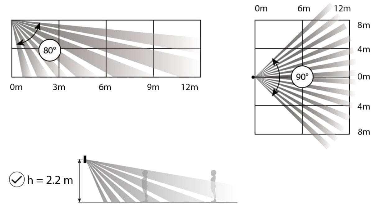 • Območje zaznavanja/kot žarka: 12 m / 90 °