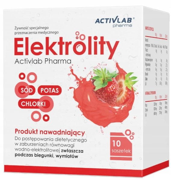 Elektroliti 10 vrečk Okus jagode Rehidracijski izdelek Za dietno uravnavanje neravnovesja vode in elektrolitov Za uporabo zlasti med drisko in bruhanjem Activlab Pharma Electrolytes je prašek za pripravo peroralne rehidracijske raztopine z zmanjšano osmolarnostjo (245 mOsm/l), ki vsebuje elektrolite. Izdelek je namenjen dietnemu uravnavanju neravnovesja vode in elektrolitov, zlasti med drisko in bruhanjem. Navodila za uporabo: 5 g odmerek (1 vrečko) raztopite v 200 ml vode. Dajte v porcijah v prvih 3–4 urah rehidracije. Otroci do 15 kg telesne teže – 4 vrečke (800 ml) Otroci nad 15 kg telesne teže in odrasli – 6 vrečk (1200 ml) Pomembne informacije: Ta izdelek je treba uporabljati pod zdravniškim nadzorom. Ni primeren za uporabo kot edini vir prehrane. Izdelek je namenjen odraslim in otrokom, starejšim od 3 let. Opozorilo: Izdelek ni namenjen parenteralni uporabi. Kontraindikacije: Izdelek vsebuje glukozo – previdnost je potrebna pri ljudeh s sladkorno boleznijo. Izdelek vsebuje natrij – previdnost je potrebna pri ljudeh, ki se zdravijo zaradi hipertenzije. Sestavine: glukoza, regulator kislosti: citronska kislina, natrijev citrat, natrijev klorid, kalijev klorid, naravna aroma jagode, sladilo: sukraloza, barvilo: rdeča pesa. Izdelek lahko vsebuje derivate: žit, ki vsebujejo gluten, soje, mleka. Hranilna vrednost: 100 g, 100 ml, 200 ml Energijska vrednost: 918 kJ / 216 kcal, 24 kJ / 6 kcal, 46 kJ / 11 kcal Maščobe: 0 g, 0 g, 0 g, vključno z nasičenimi maščobnimi kislinami: 0 g, 0 g, 0 g Ogljikovi hidrati: 54 g, 1,4 g, 2,7 g od tega sladkorji: 54 g, 1,4 g, 2,7 g Vlaknine: 0 g, 0 g, 0 g Beljakovine: 0 g, 0 g, 0 g Sol: 17 g, 0,43 g, 0,85 g Hranilne informacije: 100 g, 100 ml, 200 ml Kalij: 3200 mg, 80 mg, 160 mg Kloridi: 9200 mg, 230 mg 460 mgNatrij, 6800 mg, 170 mg, 340 mgNeto teža: 10 vrečk Proizvajalec:UNIPRO Sp. z o.o.Targowisko 553,32–015 Kłaj