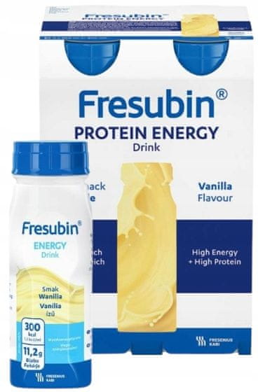 Fresubin beljakovinski energijski napitek 4 × 200 ml okus vanilije Fresubin energijski napitek je živilo za posebne medicinske namene, namenjeno posameznikom s povečanimi potrebami po energiji, med pripravo na operacijo ali hospitalizacijo ali pomanjkanjem apetita, moči in energije. Fresubin energijski napitek vsebuje vsa esencialna hranila, kot so beljakovine, maščobe (vključno z enkrat nenasičenimi maščobnimi kislinami), ogljikovi hidrati, vitamini, elementi v sledovih in makrohranila. Ne vsebuje glutena, glukoze in klinično je brez laktoze in purinskih spojin. Je dieta brez vlaknin. Le različica z okusom čokolade vsebuje majhne količine vlaknin. Uporaba: Odmerjanje mora določiti zdravstveno osebje glede na individualne potrebe bolnika. Priporočen dnevni vnos v skupni prehrani: 5–7 stekleničk (1500–2100 kcal)/dan ali dopolnilna prehrana: 2–3 stekleničke (600–900 kcal)/dan. Pomembne informacije: Uporabljati je treba pod zdravniškim nadzorom. Primerno kot edini vir prehrane. Ne dajajte otrokom, mlajšim od 3 let. Pri dajanju otrokom, mlajšim od 6 let, je potrebna previdnost. Izdelek ni namenjen uporabi pri bolnikih z galaktozemijo. Med uporabo je treba zagotoviti zadosten vnos tekočine. Navodila za uporabo: Shranjujte pri sobni temperaturi. Po odprtju lahko embalažo shranjujete v hladilniku največ 24 ur. Pred uporabo dobro pretresite. Pijte počasi! Izdelek je najbolje postreči ohlajen! Pakirano v zaščitni atmosferi. Povprečna vsebnost na 100 ml: Energijska vrednost 650 kJ (150 kcal) Beljakovine 5,6 g Maščobe 5,8 g Ogljikovi hidrati 18,5 g Vlaknine 0 g Vitamini in minerali: Vit. D3 2 μg Vit. A 170 μg ERSatrij 80 mgOsmolarnost 405 (mosmol/l)