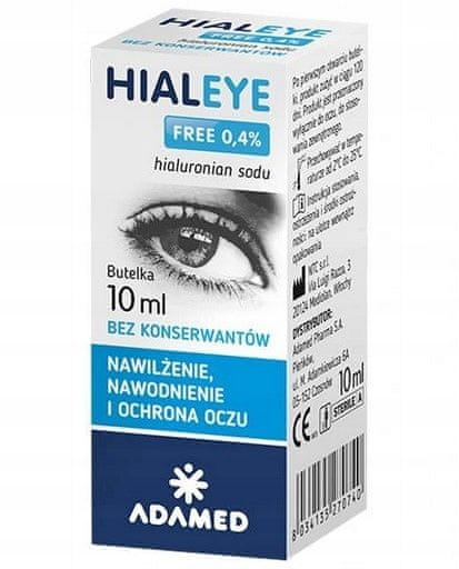 Kapljice za oči Hialeye Free 0,4 % 10 ml Kapljice za oči Hialeye Free 0,4 % so namenjene lajšanju draženja, suhosti, pekočega občutka in občutka tujka v očesu, ki jih povzročajo okoljski dejavniki, kot so veter, sonce, suh zrak, slana voda, dim, prekomerna osvetlitev, klimatska naprava, ogrevanje, dolgotrajna uporaba računalnika, pogosta in dolgotrajna uporaba kontaktnih leč. Sestavine: natrijev hialuronat 0,4 %, dinatrijev hidrogen ortofosfat dodekahidrat, natrijev dihidrogen ortofosfat monohidrat, natrijev klorid, voda. Kontraindikacije in previdnostni ukrepi: Ta izdelek je namenjen samo za uporabo v očesu. Ne uporabljajte, če ste alergični na katero koli sestavino. Ne uporabljajte v prisotnosti kvaternih amonijevih soli. Ne uporabljajte, če je embalaža poškodovana. Ne dotikajte se očesa s konico stekleničke. Ne pogoltnite. Porabite v 120 dneh po prvem odprtju. Shranjevati nedosegljivo otrokom. Shranjujte pri sobni temperaturi. Odmerjanje: 1 kapljica v oko 2–3-krat na dan, po potrebi. 1 kapljico vkapajte v oko tako, da nežno pritisnete na stekleničko. Kontraindikacije: Ne uporabljajte, če ste alergični na sestavo pripravka. Medicinski pripomoček – oznaka CE št.: 0426. Ima izjavo EU o skladnosti. Vključuje navodila za uporabo in vmesnik v poljščini. Vključuje etiketo v poljščini.