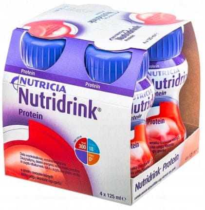 Nutridrink Protein 4 × 125 ml, okus gozdnih sadežev. Nutridrink Protein je peroralno prehransko dopolnilo: živilo za posebne medicinske namene za dietno obvladovanje podhranjenosti in z boleznijo povezanega tveganja podhranjenosti pri bolnikih s povečanimi potrebami po beljakovinah. Uporabljajo ga posamezniki, ki iz različnih razlogov ne morejo dobiti zadostnih količin hranil za zadovoljevanje svojih dnevnih prehranskih potreb samo s tradicionalno prehrano. Izdelki Nutridrink Protein se uporabljajo v primerih, ko iz različnih razlogov zadovoljevanje telesnih potreb (pogosto povečanih zaradi bolezni) s tradicionalno prehrano ni mogoče ali ni zadostno, zlasti v primerih, kot so: povečana potreba po hranilih (zlasti beljakovinah) zaradi bolezni, pomanjkanje apetita in odpor do prehranjevanja, težave s prehranjevanjem (grizenje, žvečenje, požiranje), motena prebava in absorpcija, ki se kaže v prebavnih težavah, kot so slabost, bruhanje, driska in/ali zaprtje. Za koga: Izdelki Nutridrink Protein se uporabljajo v situacijah, ko zaradi različnih razlogov zadovoljevanje telesnih potreb (pogosto povečanih zaradi bolezni) s tradicionalno prehrano ni mogoče ali nezadostno, zlasti v situacijah, kot so: med okrevanjem po bolezni, pri pripravi na in po operaciji, med in po hudi bolezni (ki zahteva daljše bivanje v bolnišnici), pri kroničnih boleznih, ki zahtevajo povečan vnos beljakovin, npr. pri raku, v procesu rehabilitacije, npr. po kapi. Zdrava odrasla oseba naj bi vsak dan zaužila približno g beljakovin/kg telesne teže. Potrebe po beljakovinah se lahko pri nekaterih zdravstvenih stanjih celo podvojijo. Priporočen vnos: 1–3 STEKLENIČKE NA DAN NAJMANJ 14 DNI ali dlje, po priporočilu zdravnika (kot prehransko dopolnilo). Nutridrink Protein se lahko uporablja kot prehransko dopolnilo med obroki ali kot dodatek k obrokom za povečanje njihove hranilne vrednosti. Ta izdelek je pripravljen za pitje. Nutridrink Protein pijte počasi, eno stekleničko naenkrat, približno 30 minut. Pred uporabo dobro pretresite. Najbolje postreženo ohlajeno. Po prvem odprtju izdelek shranjujte v zaprti steklenici v hladilniku do 24 ur.