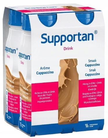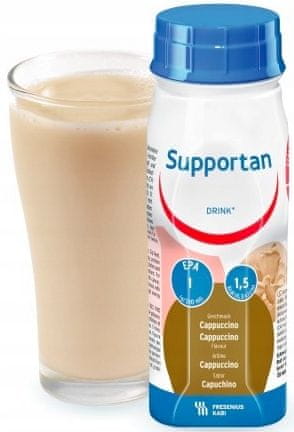 Napitek Supportan 4 × 200 ml, okus kapučina, Supportan NAPITEK je živilo za posebne medicinske namene. Priporočljiv je za onkološke bolnike, tiste, ki so oslabljeni in jim grozi kaheksija, kadar bolniki ne morejo zagotoviti vseh potrebnih hranil. Ker ima prehrana ključno vlogo med onkološkim zdravljenjem, je ta specializirana dieta priporočljiva pred zdravljenjem, med terapijo in med okrevanjem. Supportan NAPITEK je popolna, visokoenergijska dieta, ki: pomaga zmanjšati stranske učinke kemoterapije in ima blagodejen učinek na imunost zaradi vsebnosti omega-3 maščobnih kislin*, pomaga preprečevati izgubo mišic zaradi visoke vsebnosti beljakovin in pomaga obnoviti moč in energijo za boj proti bolezni. Način uporabe: Določiti mora zdravstveno osebje glede na individualne potrebe bolnika. Priporočeni odmerek za dopolnilno prehrano: 2 steklenički (600 kcal)/dan ali popolna prehrana: ≤ 5 stekleničk (1500 kcal)/dan. Navodila za uporabo: Shranjujte pri sobni temperaturi. Po odprtju lahko embalažo hranite v hladilniku največ 24 ur. Pred uporabo dobro pretresite. Pijte počasi! Izdelek je najbolje uporabljati ohlajenega. Pomembne informacije: Uporabljati ga je treba pod zdravniškim nadzorom. Primerno kot edini vir prehrane. V primeru popolne prehrane je treba upoštevati visoko vsebnost ribjega olja in beljakovin. Ne dajajte otrokom, mlajšim od 3 let. Pri dajanju otrokom, mlajšim od 6 let, je potrebna previdnost. Izdelek ni namenjen uporabi pri bolnikih z galaktozemijo. Med uporabo je treba zagotoviti zadosten vnos tekočine. Povprečna vsebnost v 100 ml Energijska vrednost 650 kJ (150 kcal) Beljakovine 10 g Maščobe 6,7 g EPA 0,5 g DHA 0,21 g Ogljikovi hidrati 11,6 g Vlaknine 1,5 g Vitamini in minerali: Vitamin D 2,5 μg Vitamin A 213 μg ERSatrij 47,5 mg Osmolarnost 435 (mosmol/l)