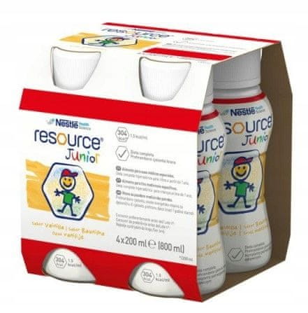 Resource Junior Okus vanilije 4 × 200 ml Živilo za posebne zdravstvene namene. Zagotavlja prehransko popolno, visokoenergijsko tekočo prehrano za otroke, starejše od 1 leta. Zagotavlja vsa esencialna hranila v otrokovi prehrani. Okus: Vanilija. Brez glutena. Lastnosti: Poveča energijo v prehrani (1 pakiranje vsebuje 304 kcal). Zagotavlja esencialna hranila v otrokovi prehrani. Različni okusi preprečujejo monotonost obrokov. Namen uporabe: Tekočina Resource Junior je namenjena prehranski obravnavi otrok, starejših od 1 leta, s podhranjenostjo, povezano z boleznijo ali s tveganjem za njen pojav, vključno z: motnjami požiranja, grizenja in žvečenja, motnjami rasti, kronično drisko, v primerih, ko obstaja tveganje za podhranjenost, cistični fibrozi, anoreksiji nervozi, perioperativnem obdobju, kroničnih boleznih, vključno z rakom. Navodila za uporabo: Kot prehransko dopolnilo: 1–3 stekleničke na dan. Kot edini vir prehrane: po priporočilu zdravnika.