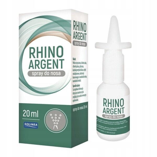 Rhinoargent nosni sprej 20 ml Rhinoargent ustvari zaščitni film na nosni sluznici in jo ščiti pred škodljivimi zunanjimi dejavniki. Izdelek podpira regeneracijo nosne sluznice. Uporaba: Za uporabo pri regeneraciji nosne sluznice. Sestavine: Prečiščena voda, natrijev klorid, kalijev klorid, glicerin, karboksimetilceluloza, olje evkaliptusa, konzervansi: srebrov nanokoloid, bakrov nanokoloid. Navodila za uporabo: Aplikator namestite v nosnico in pritisnite za 1–2 odmerka. Nanos ponovite 3-krat na dan. Kontraindikacije: Preobčutljivost za katero koli sestavino. Embalaža: 20 ml Opombe: Hraniti izven dosega otrok. Medicinski pripomoček – oznaka CE. Izjava EU o skladnosti. Vključuje navodila za uporabo in vmesnik v poljščini. Vključuje etiketo v poljščini.