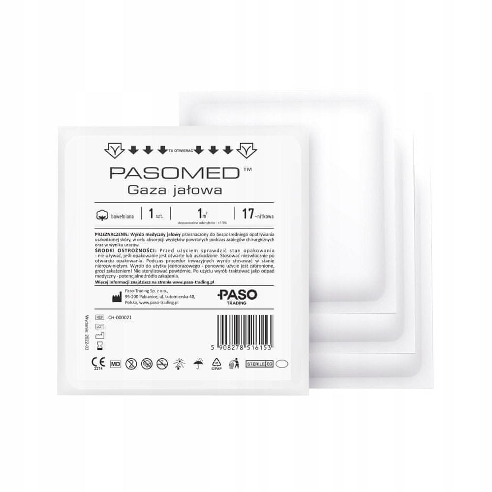 Sterilni 17-nitni povoji iz gaze PASOMED, 1 m², 1 kos. Izdelani iz 100 % bombažne, 17-nitne gaze, ki izpolnjuje najvišje standarde kakovosti in je skladna z evropskim standardom EN 14079. Široko se uporablja v medicini. Namenjeni so predvsem za prevezovanje ran, absorpcijo izločkov, ki nastanejo pri kirurških posegih in poškodbah. UPORABA: Ta medicinski pripomoček za enkratno uporabo je namenjen neposrednemu previjanju poškodovane kože, absorpciji izločkov, ki nastanejo pri kirurških posegih in poškodbah. Ta medicinski pripomoček ima oznako CE. Ima izjavo EU o skladnosti. Vključuje poljska navodila za uporabo.