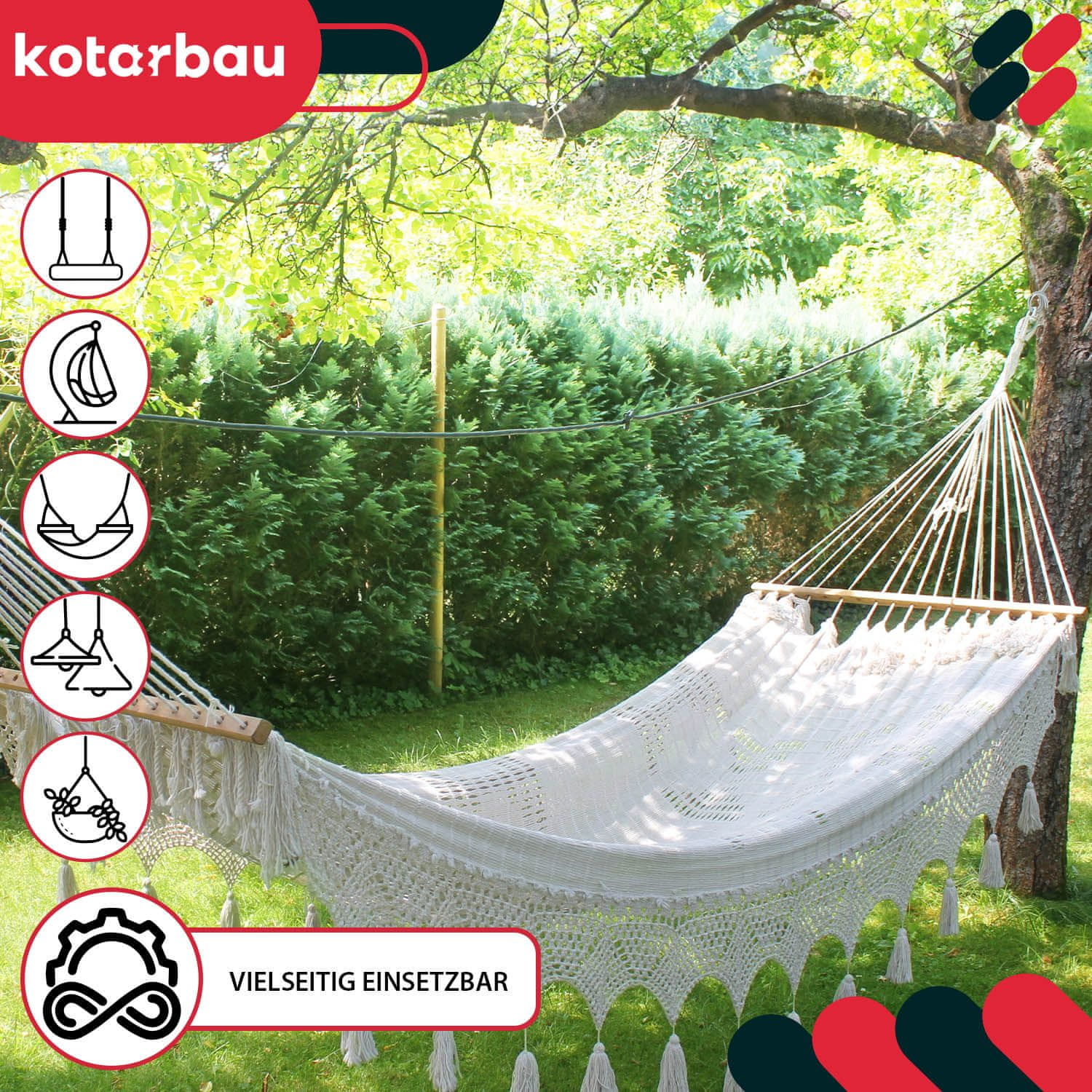 Kavelj za gugalnico je univerzalno uporaben izdelek. Idealen je za pritrditev gugalnic, visečih mrež ali visečih stolov, zaradi česar je nepogrešljiv na vrtu. Uporablja se lahko tudi kot obešalnik za sadilnike, svetilke ali druge okrasne predmete doma in v delavnici. Zaradi svoje vsestranskosti je naložba, ki bo nedvomno našla veliko uporab v različnih situacijah. VARNOST: Varna uporaba gugalnega kavlja je ključni vidik.