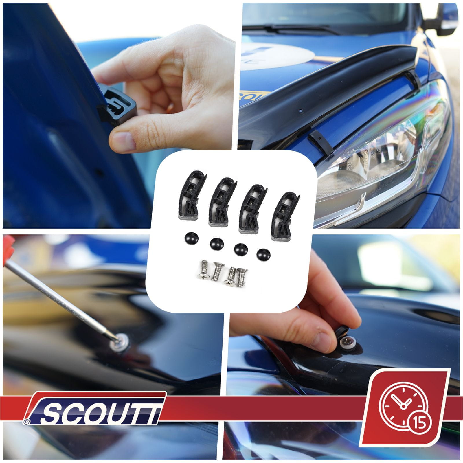 Zaradi preproste namestitve lahko deflektor namesti vsakdo. Namestitev traja približno 10 minut, namestitev je brez vrtanja in uporabe zunanjega lepilnega traku. Na pokrov motorja je pritrjen s posebej zasnovanimi tesnili, ki se ovijejo okoli pokrova motorja in ustvarijo trden oprijem deflektorja. Deflektor Scoutt® je izdelan iz vrhunskega 3 mm debelega, visokokakovostnega in trpežnega pleksi stekla PMMA dimne barve.