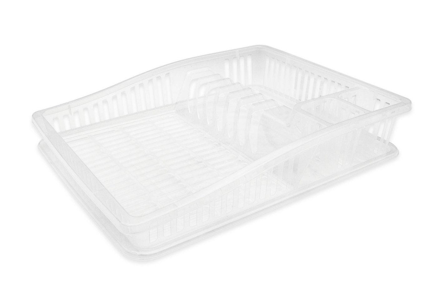 Odcejalnik s pladnjem, 30 × 39 × 8 cm. Plastični material prozoren (prosojen), barva glede na razpoložljivost na zalogi. Razdeljen za jedilni pribor, krožnike in drugo posodo. Odcejalnik s pladnjem. EAN 8696287071080