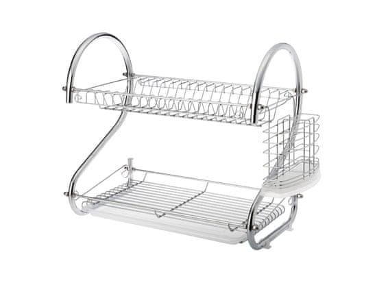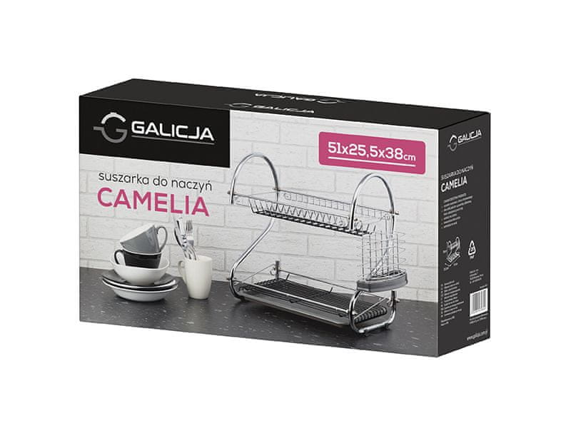 Zanimiv dizajn kovinske posode za odcejanje CAMELIA vas bo navdušil že na prvi pogled. Zanimivo stojalo v obliki črke „S“ ima kapalko za jedilni pribor in kozarce. Izdelan je iz kromirane žice. V spodnjem delu je bela plastična posodica za zbiranje vode. Odcejalno posodo za jedilni pribor lahko glede na vaše potrebe obesite na tisto stran sušilnega stroja, ki vam ustreza. S silikonom prevlečena površina spodnjih delov je nedrseča in tako omogoča varno in zanesljivo odlaganje pomite posode, brez nevarnosti zdrsa. Oblika kapalnika Camelia se bo podala k vsakemu kuhinjskemu slogu in bo poleg praktičnega pomočnika tudi oblikovalski dodatek. Njene dimenzije (ŠxGxV): 51×25,5×38 cm.