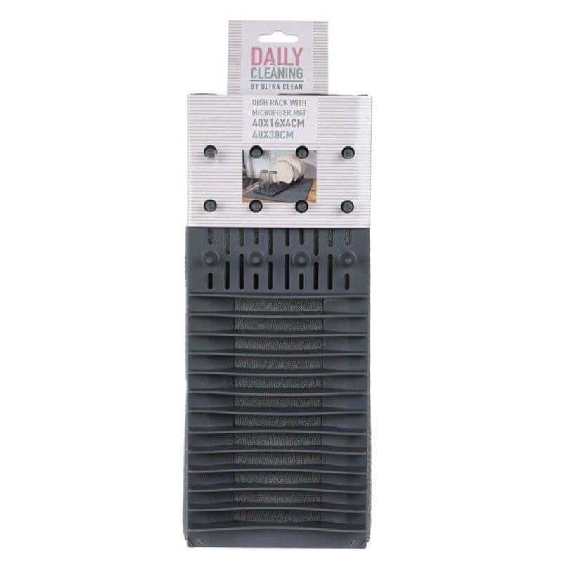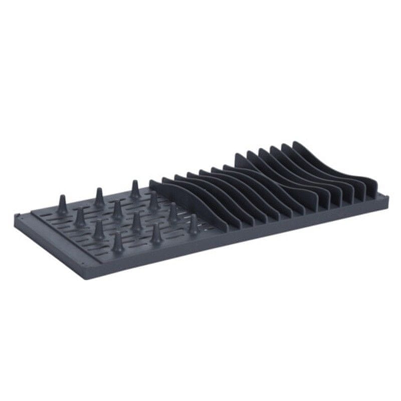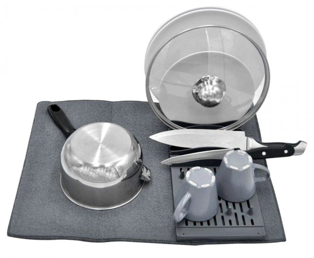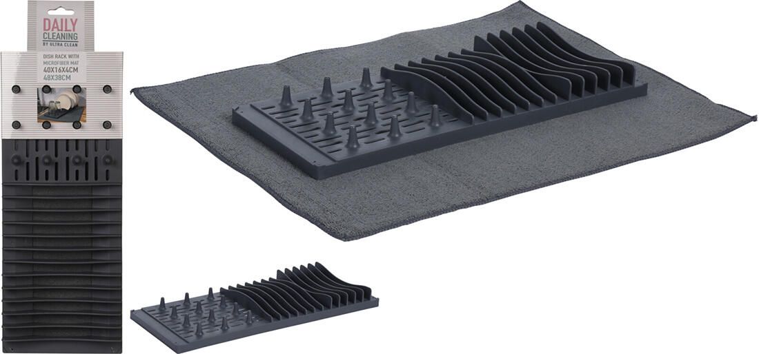 • večnamenski odcejalnik za posodo s podlogo – kompakten, prenosen, nezahteven za vzdrževanje – organizator krožnikov in odcejalna podloga, oba dela se lahko uporabljata tudi ločeno- podloga za odcejanje oprane posode iz mikrovlaken- hitro sušenje in material, odporen na madeže- mehak in prijazen do posode- prihrani prostor v kuhinji in pri shranjevanju- prilagodljiv pladenj za odcejanje je vedno pripravljen za uporabo- mere podloge za odcejanje: 48 × 38 cm- dimenzije organizatorja krožnikov: 40 × 16 cm- barva: siva