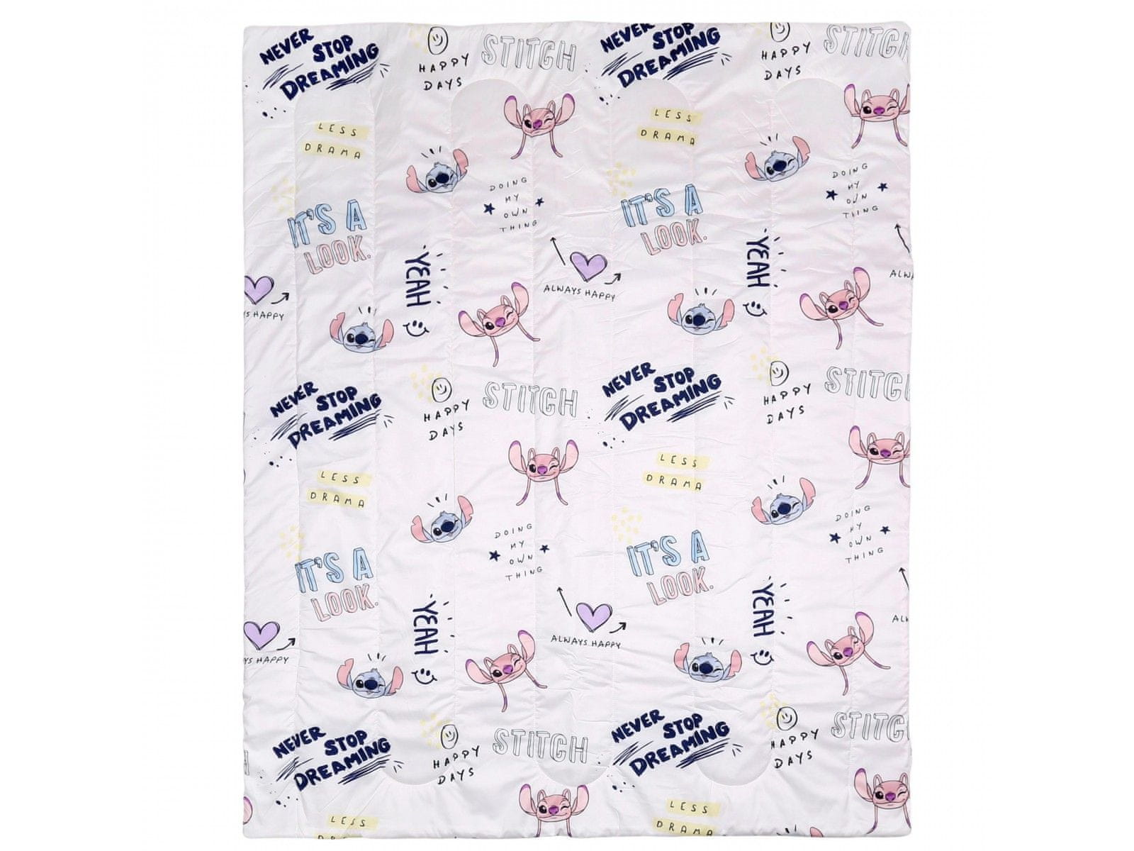 Obojestranska, belo-roza odeja s ponavljajočimi se podobami Andzie in Stitcha ter zabavnimi napisi.