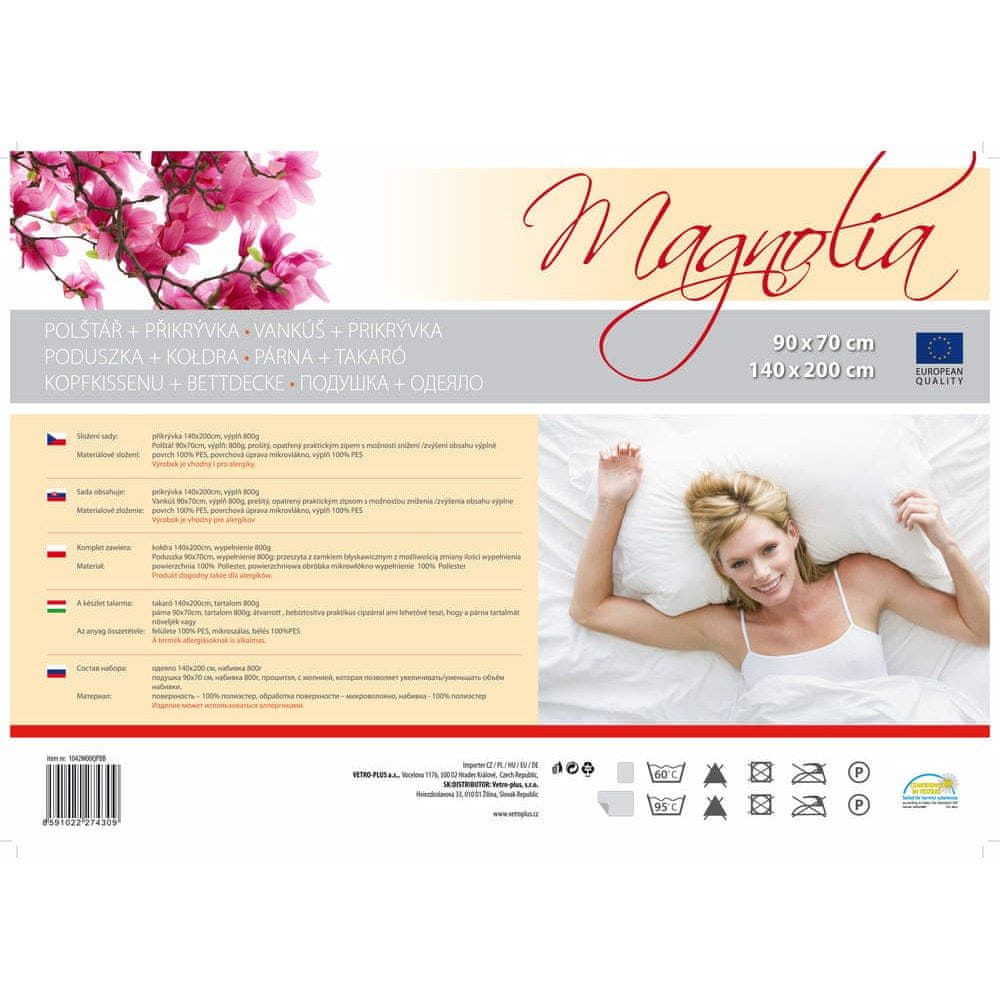 Vzglavnik MAGNOLIA 90 × 70 cm in odeja 140 × 200 cm, bela barva, površina 100 % poliestrska mikrovlakna, všit vzglavnik z zadrgo z možnostjo zmanjšanja ali povečanja vsebnosti polnila, 100 % poliestrsko kroglično polnilo 800 g, odeja 100 % poliester. Vzglavnik – šivan, opremljen s praktično zadrgo z možnostjo zmanjšanja/zvečanja vsebnosti polnila