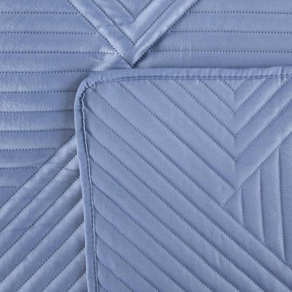 Ekskluzivno pregrinjalo iz mehkega in na otip prijetnega žameta, prešitega v velikem in gostem vzorcu ribje kosti. Prešivanje je izvedeno z brezšivno metodo vročega tiska. Širina: 170 cm, dolžina: 210 CM cm, barva: modra, teža: 250+120+65 GSM, sestava: 100 % poliester
