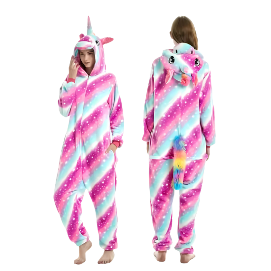 Igriva pižama s kapuco, na kateri so ušesa in rog, posnema samoroga.