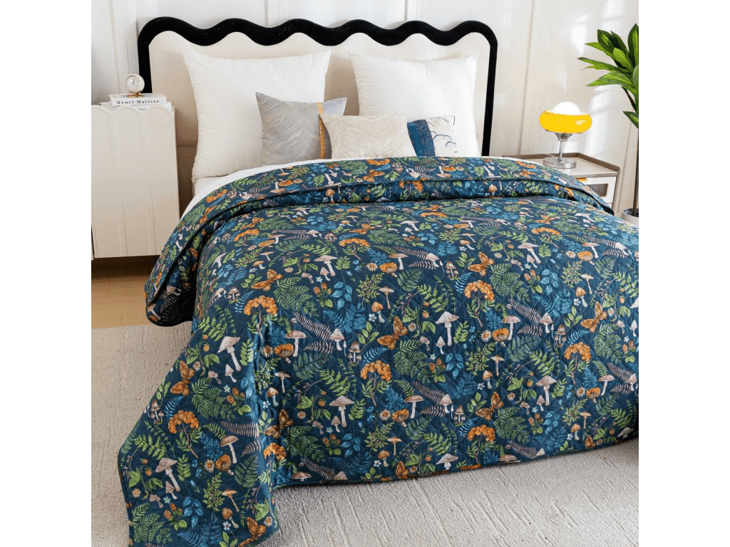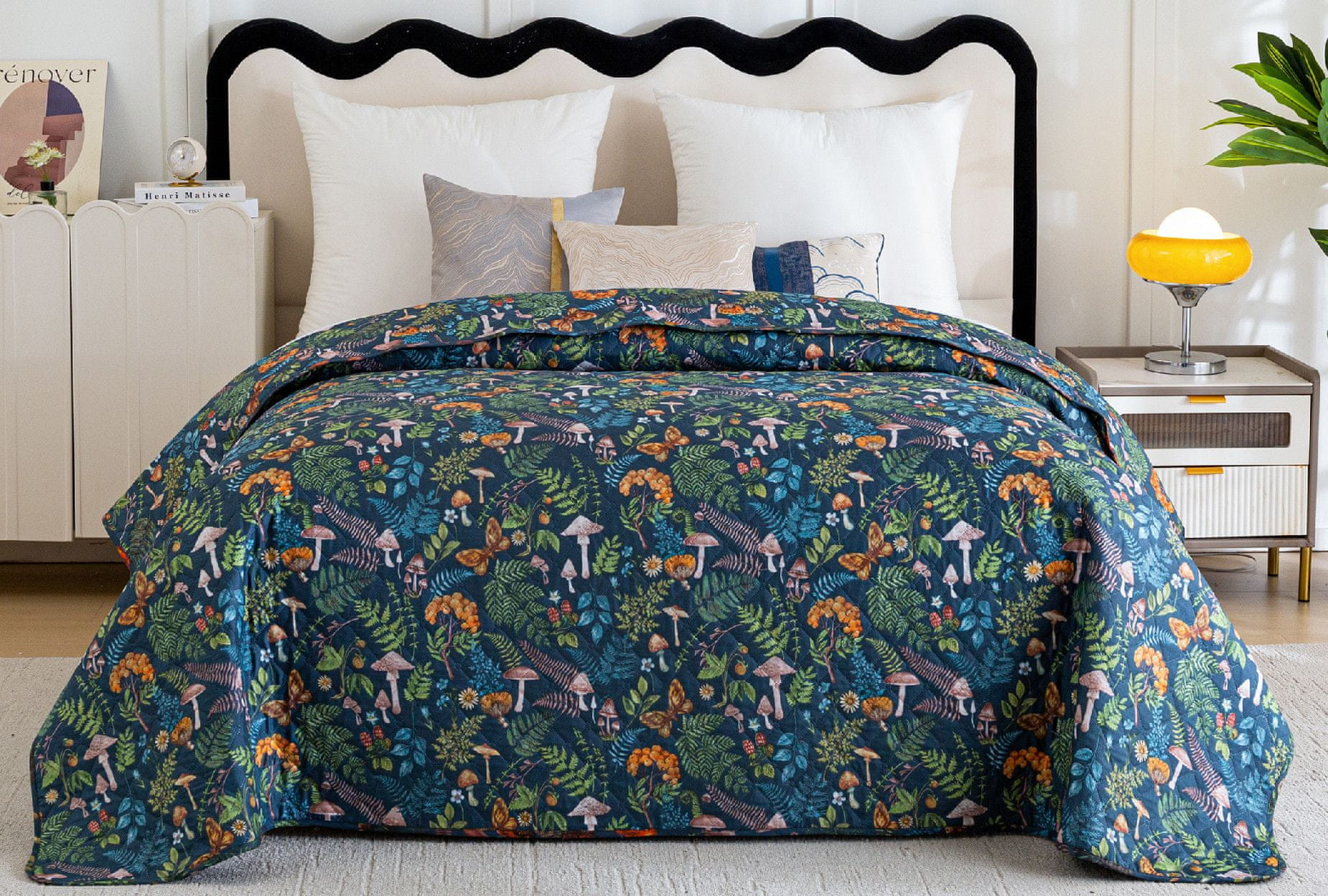 Oživite svojo spalnico s pregrinjalom za posteljo MUSHROOMS AND PLANTS, ki prinaša edinstven motiv narave, poln gob, rastlin in gozdnih podrobnosti. Barvni vzorec na temnem ozadju bo vašemu interierju dodal originalno in prijetno vzdušje. Celoten opis