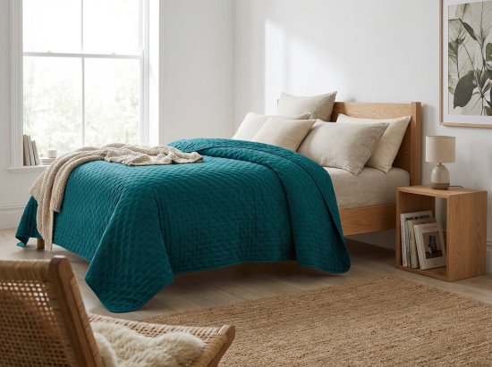 Žametno pregrinjalo ASTRALIA v elegantni petrol barvi bo v vašo spalnico vneslo globino, mir in pridih razkošja. Mehka žametna površina iz 100 % poliestra je prijetna na dotik, trpežna in enostavna za vzdrževanje. Fini šivi ustvarjajo subtilno strukturo, ki poudarja nasičenost barv in daje pregrinja Celoten opis