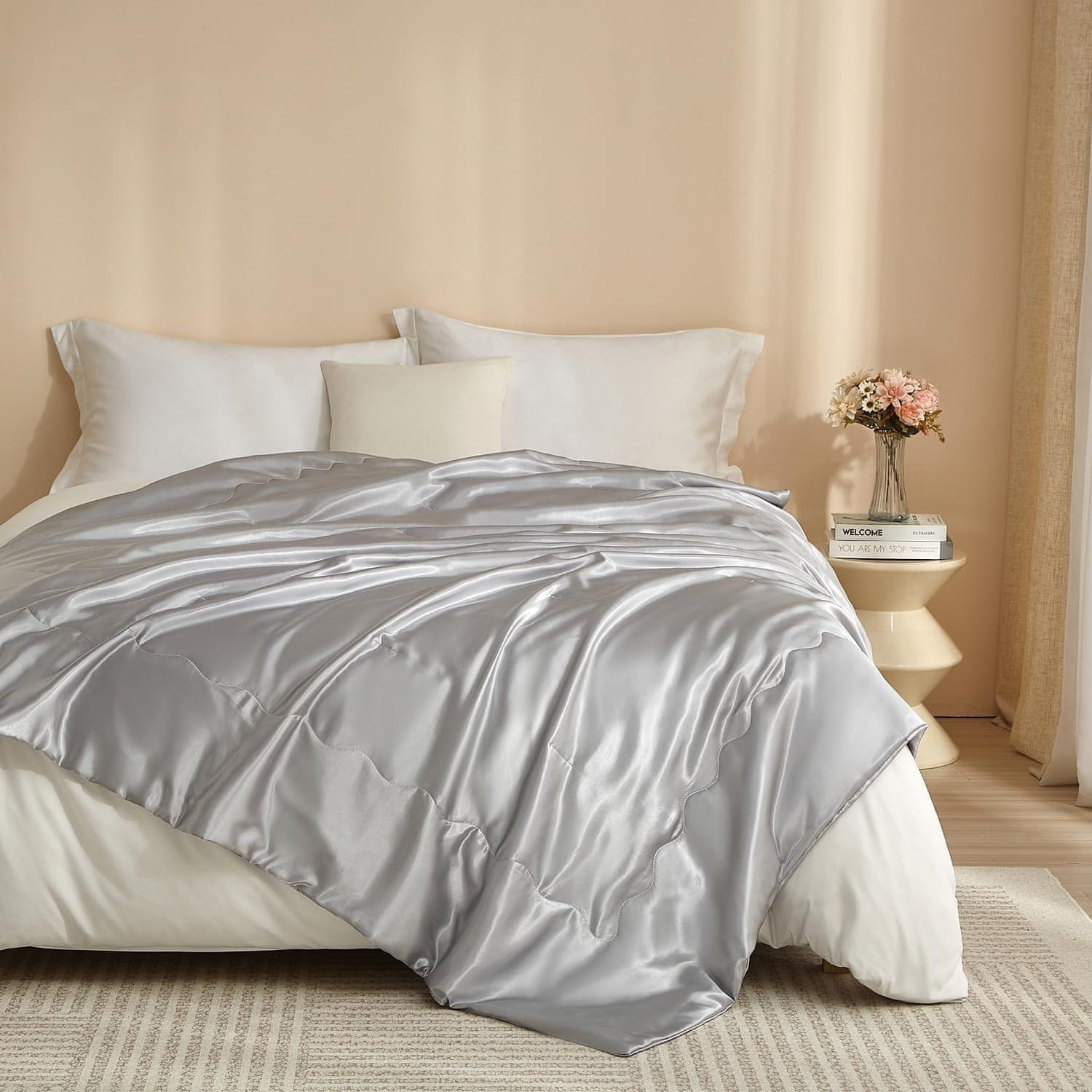 Udobna satenasta odeja in pregrinjalo v sivi barvi