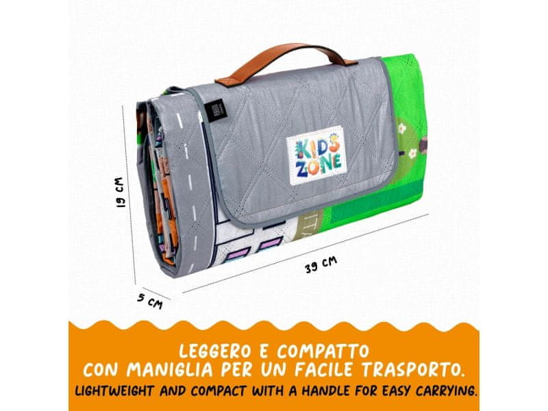 Otroška odeja za piknik Perletti z motivom avtomobilske steze je kot nalašč za male pustolovce! Z dimenzijami 150 × 150 cm ponuja dovolj prostora za 2–3 otroke, ki želijo uživati v igri na travi, risanju, pikniku ali sproščanju na soncu.