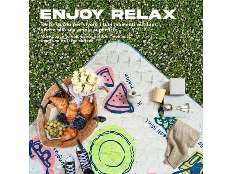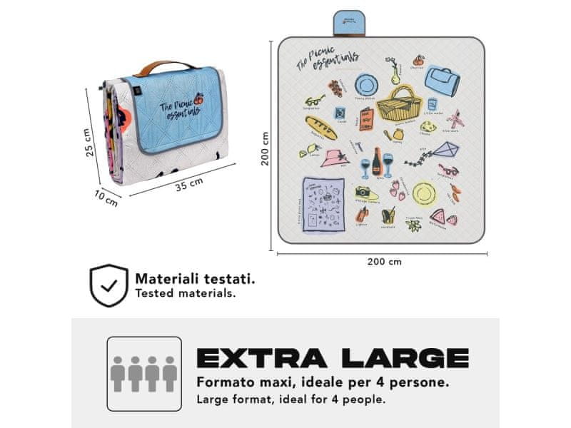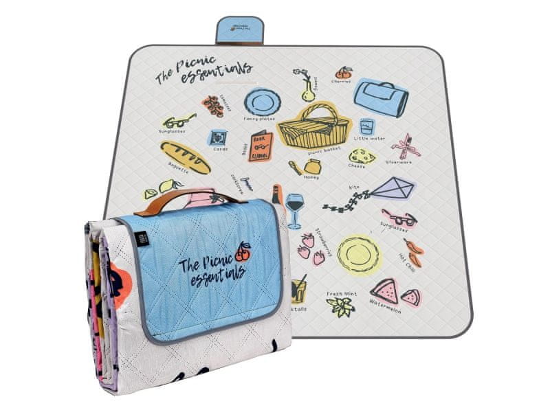 Perletti Travel – Essentials zagotavlja popolno ravnovesje med funkcionalnostjo in slogom. Z dimenzijami 200 × 200 cm zagotavlja dovolj prostora za štiri osebe za piknik v parku, dan na plaži ali sprostitev na vrtu. Spodnja plast iz vodoodbojnega materiala PEVA zanesljivo ščiti pred vlago, peskom in umazanijo, medtem ko je zgornja tekstilna površina mehka na otip in odporna na obrabo. Zahvaljujoč praktičnemu sistemu za zlaganje z vgrajenim ročajem odejo v nekaj sekundah zložite v kompaktno embalažo. Vesel vzorec „potrebščin“ – košarice, sadja, pijače in nujnih pripomočkov za piknik – bo zagotovo poskrbel, da bo vsak izlet malce lepši in zabavnejši.